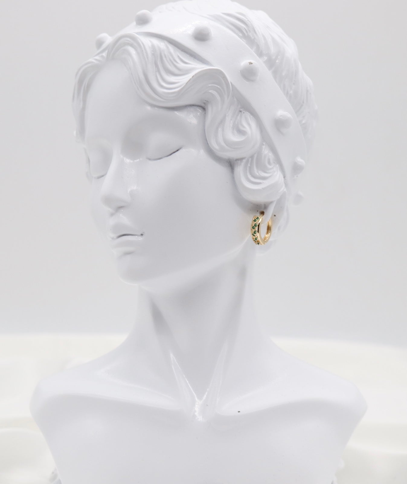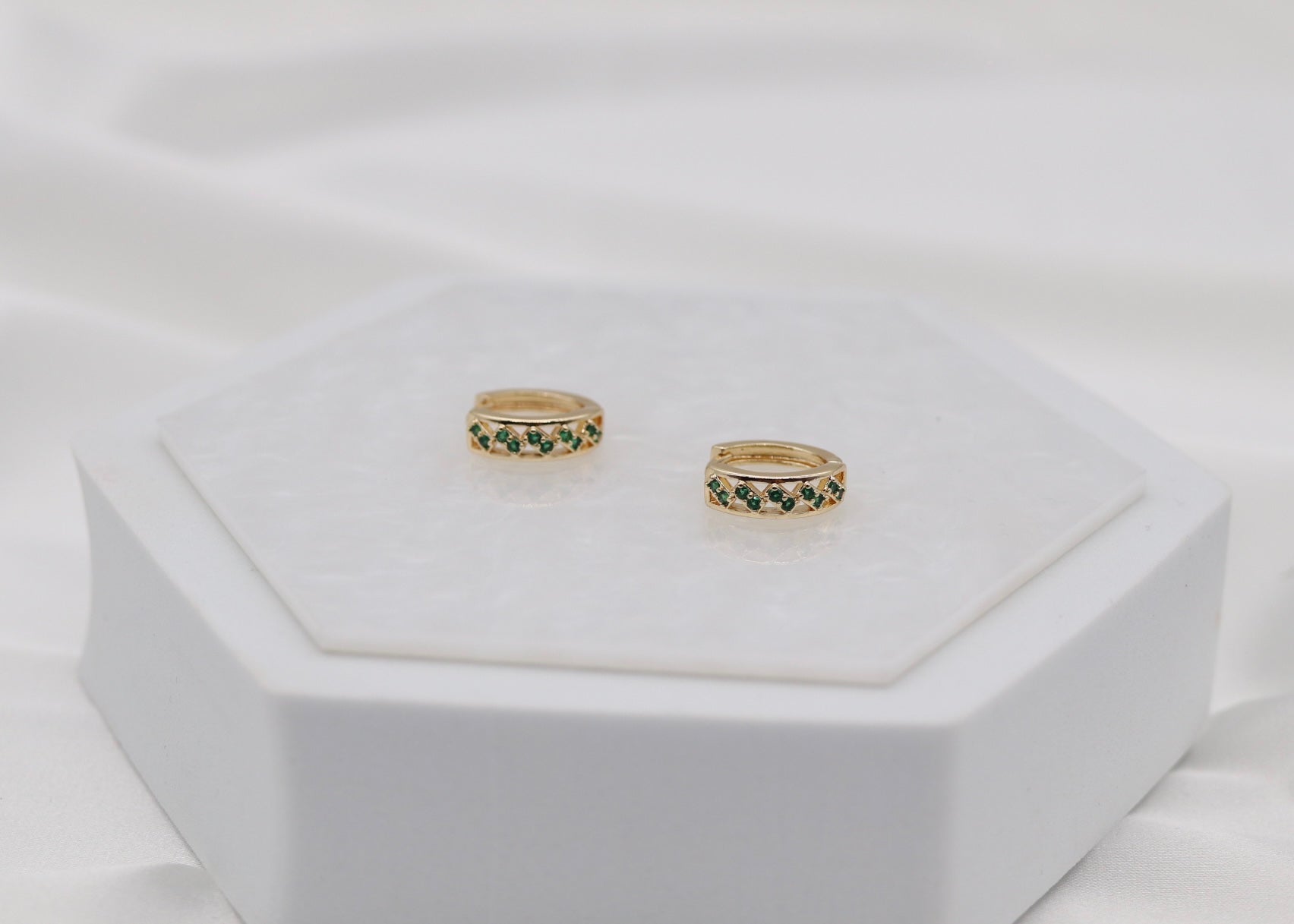 These elegant gold huggie hoops feature a stunning lattice design accented with rich emerald-green stones for a look that’s both timeless and modern. The structured crisscross detailing adds dimension and sparkle, making them perfect for everyday wear or dressed-up evenings. Lightweight, comfortable, and effortlessly chic, these hoops are a beautiful statement in a perfectly wearable size — ideal for stacking or wearing solo for a refined pop of color.