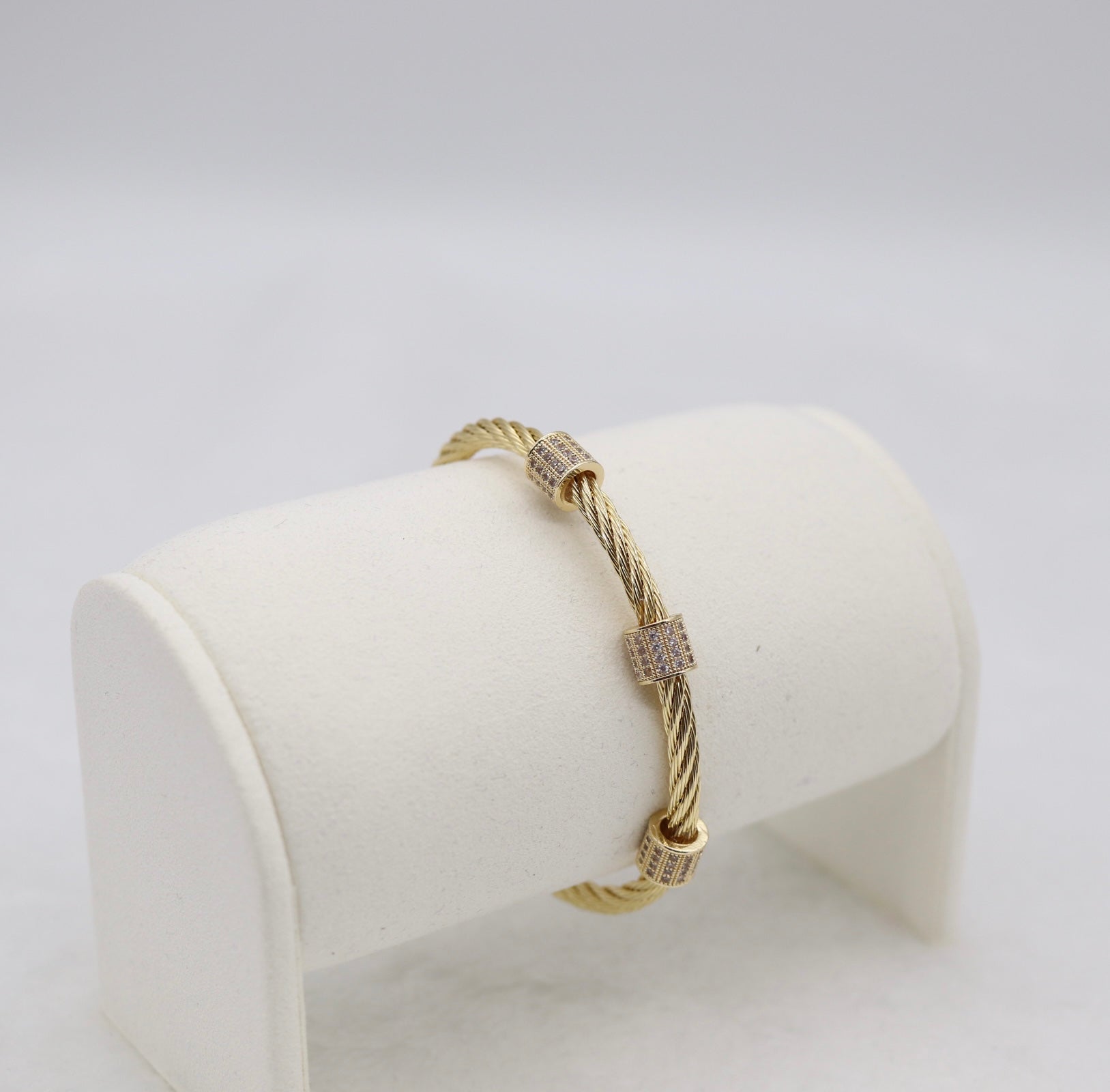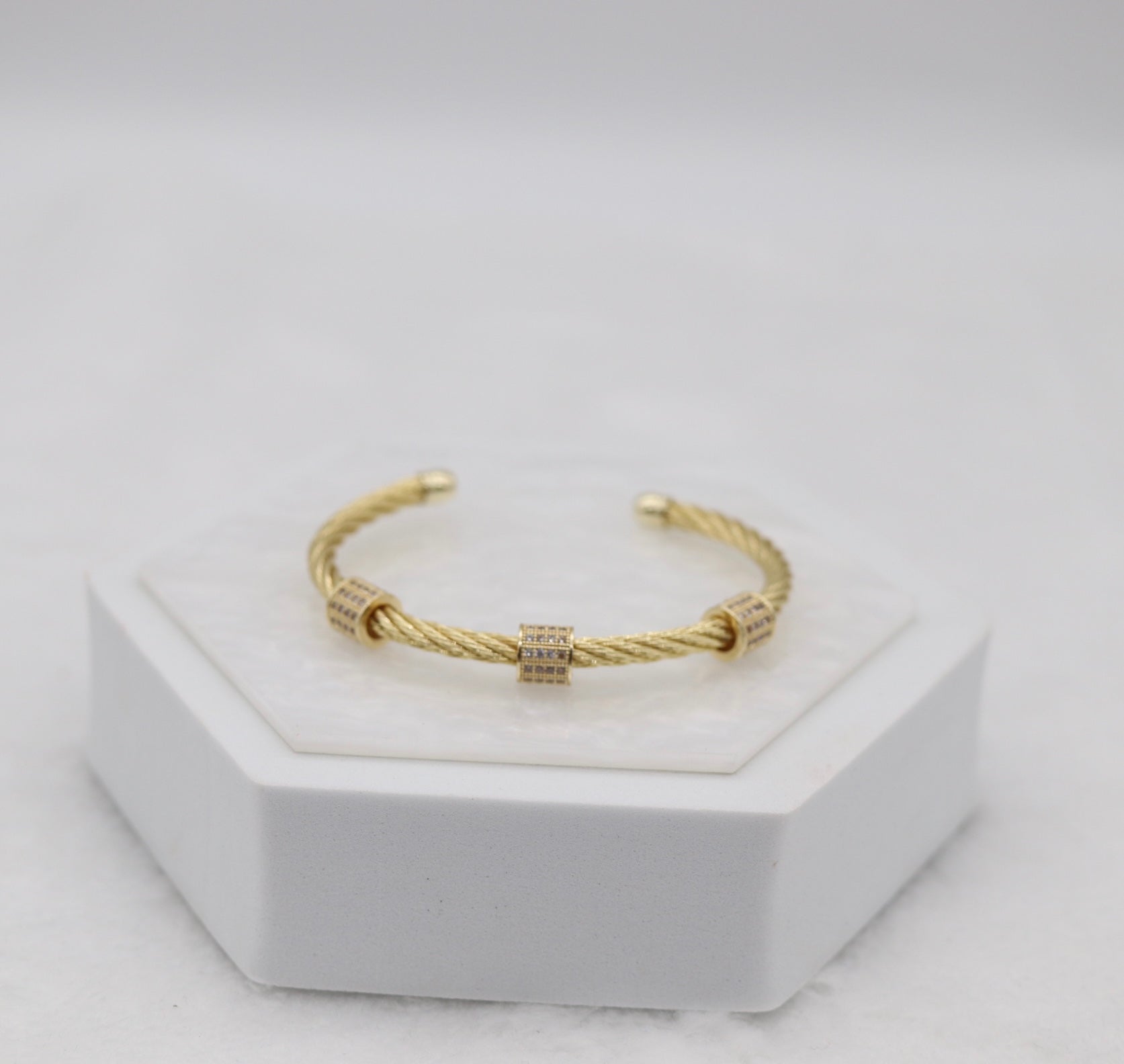 Gold Cable Cuff Bracelet with Pave Crystal Barrel Accents