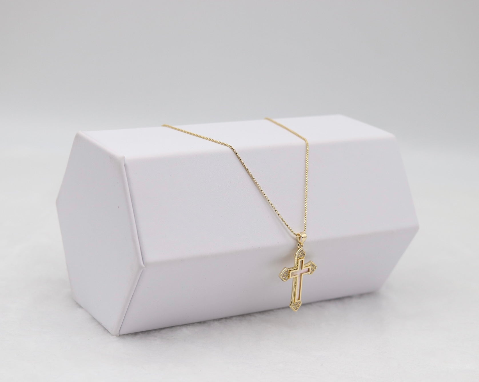 A timeless symbol of faith and elegance, this gold cross pendant necklace features a sleek center design accented with delicate detailing at each end. Crafted on a fine gold chain, it offers a refined, polished look perfect for both daily wear and special occasions. A beautiful expression of spirituality and style in one graceful piece.