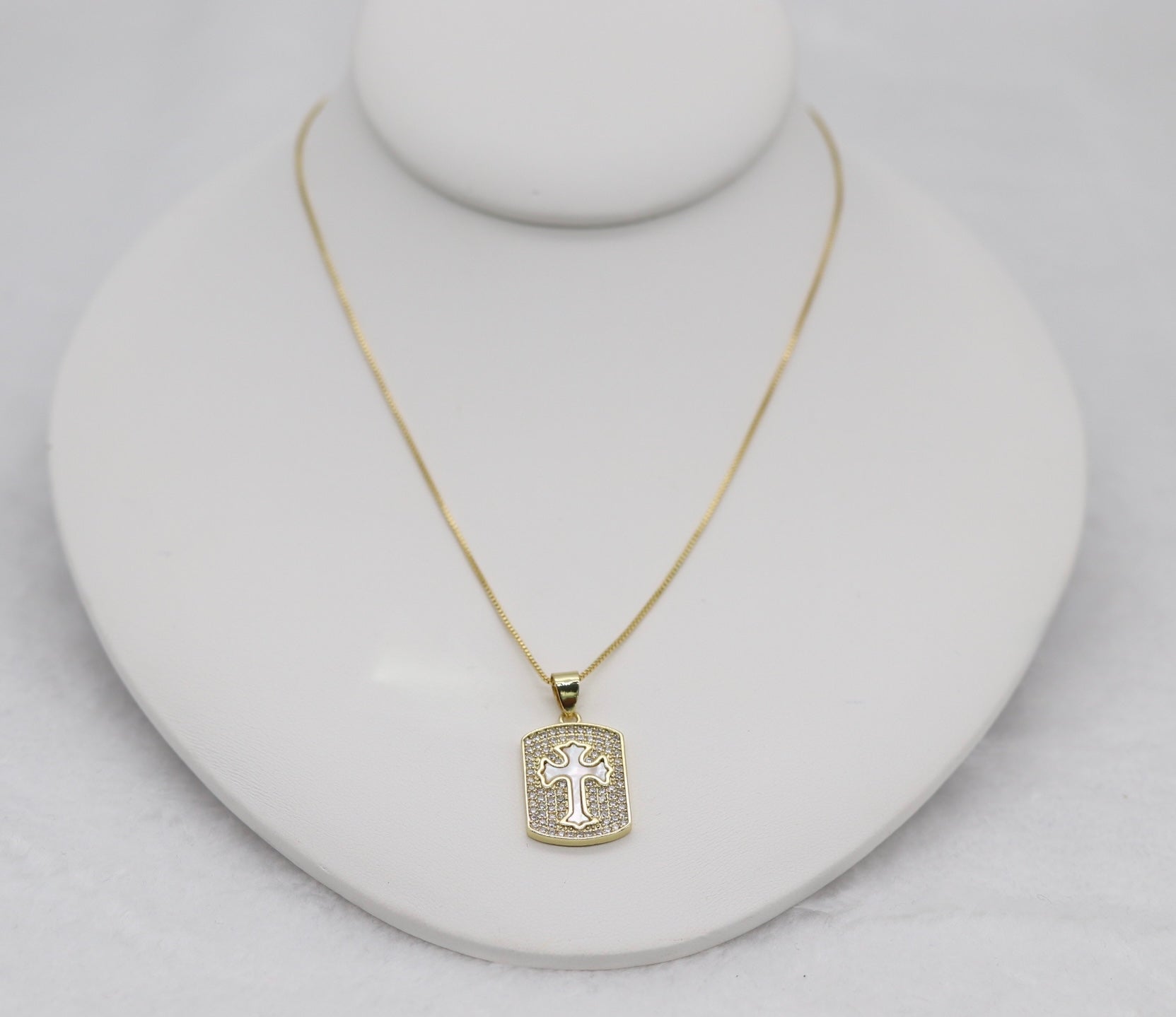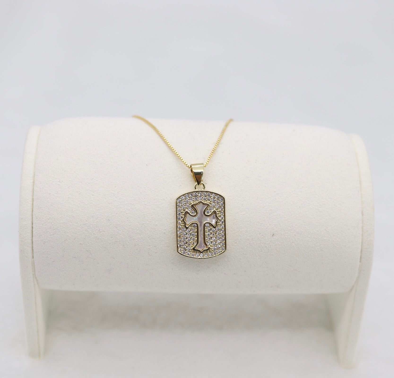 A bold yet elegant statement of faith. This gold cross pendant necklace features a beautifully detailed cross set against a shimmering pavé crystal background. The dog tag–style pendant adds a modern touch, while the gold chain enhances its classic appeal. Perfect for everyday wear, special occasions, or as a meaningful gift.