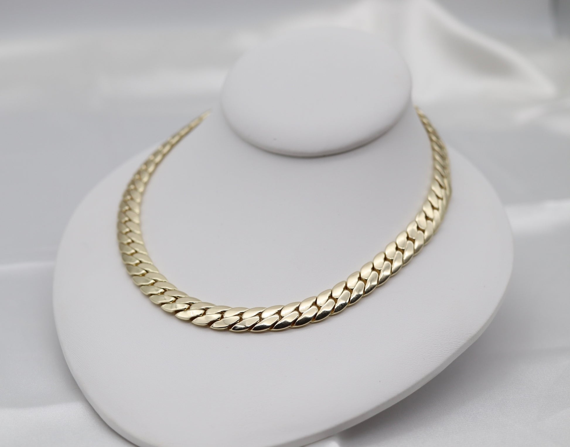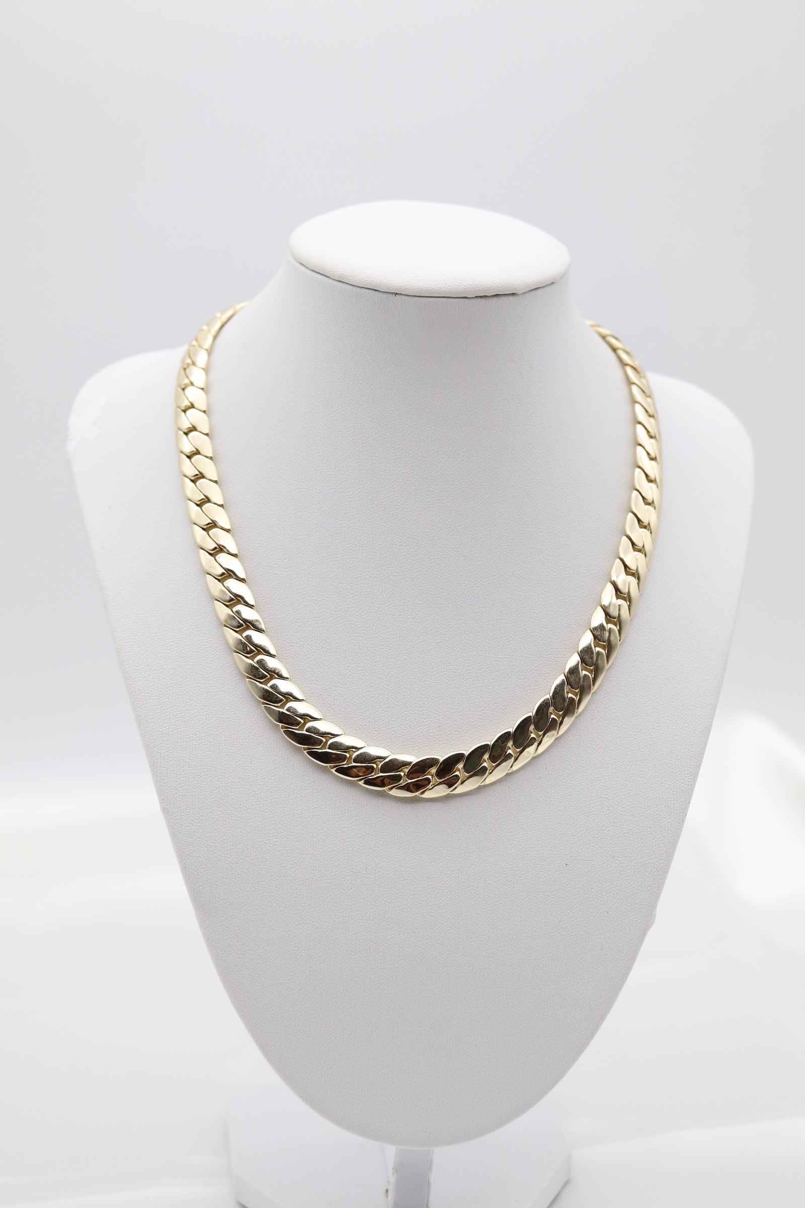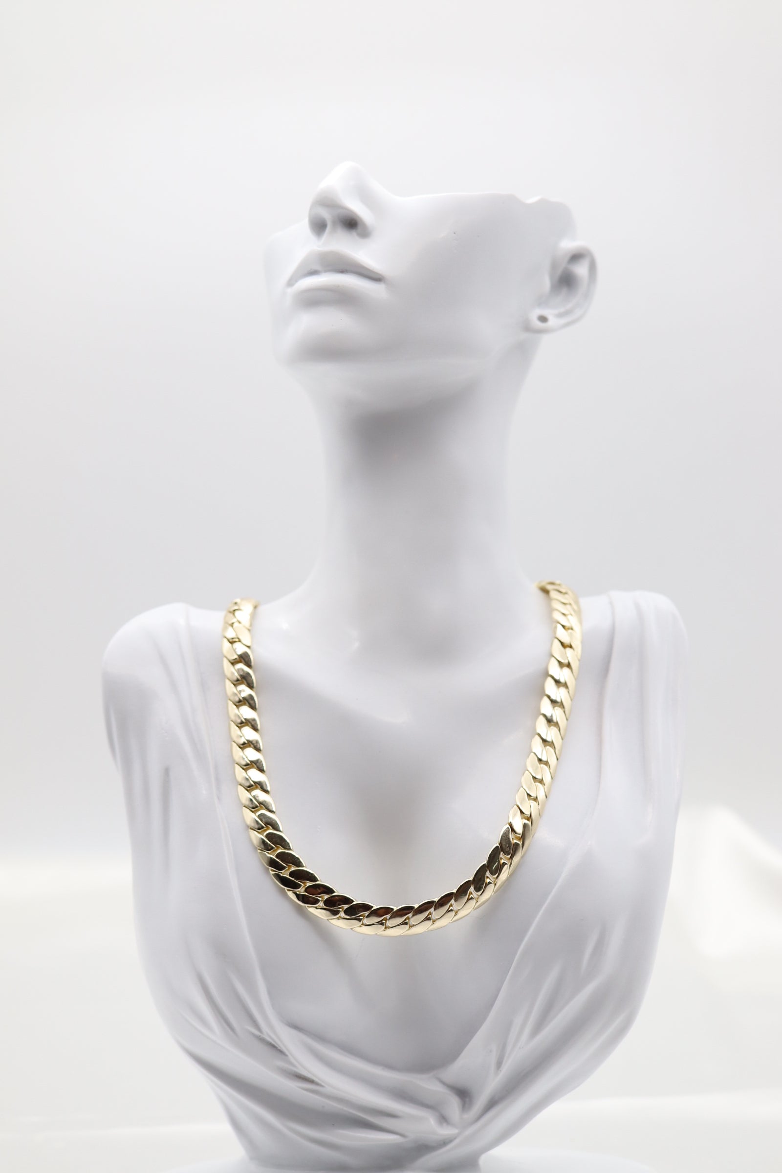 The Gold Cuban Link Necklace features thick, tightly interlocking links in polished gold, delivering a bold and luxurious statement. Its timeless design exudes elegance and sophistication, making it a versatile piece for both casual and formal occasions.