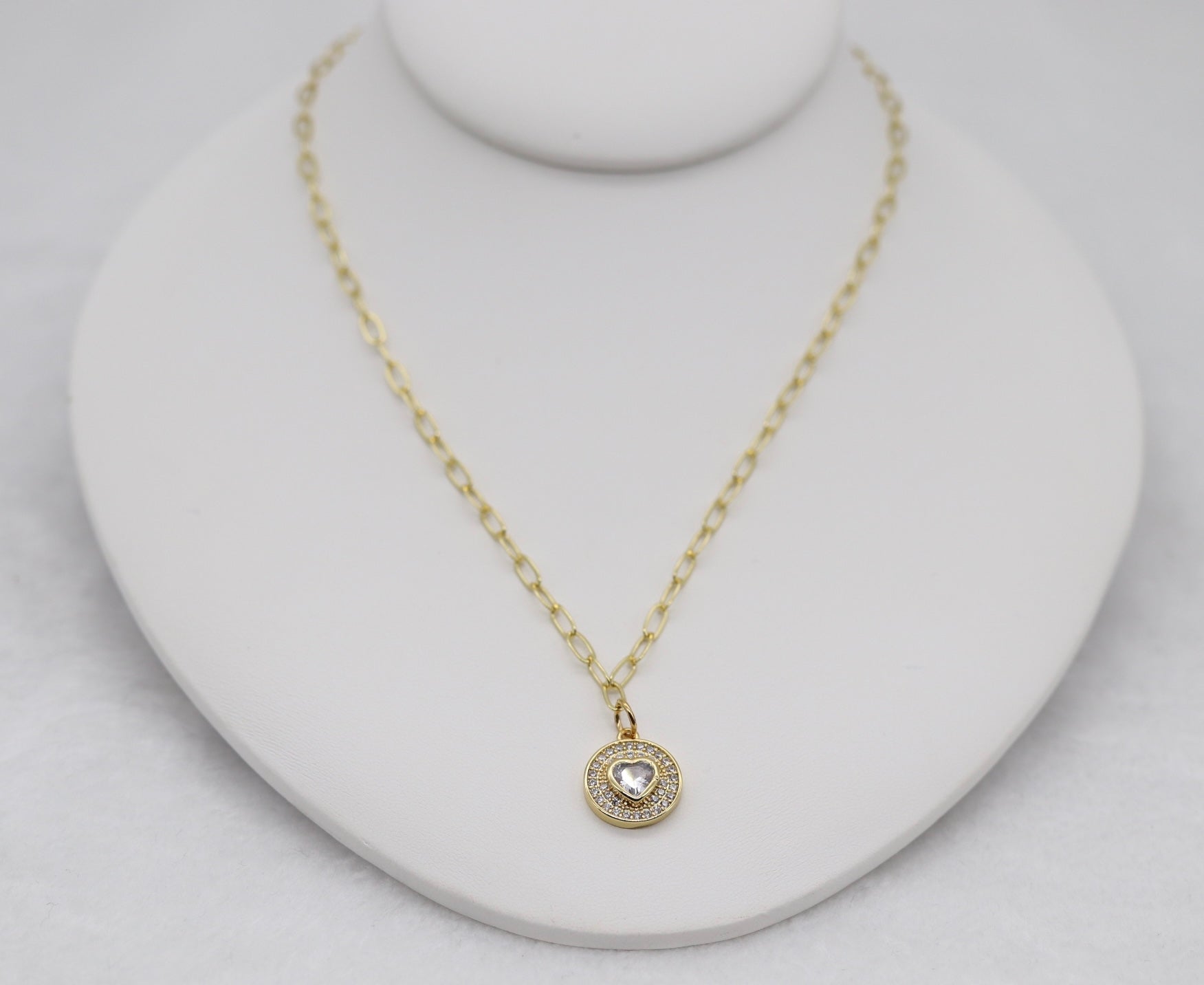 A perfect blend of elegance and romance, this gold heart medallion necklace features a radiant heart-shaped crystal set in a round pendant accented with shimmering pavé details. The gold paperclip chain adds a chic modern touch, making it a versatile statement piece for everyday wear or special occasions. A timeless symbol of love and style.