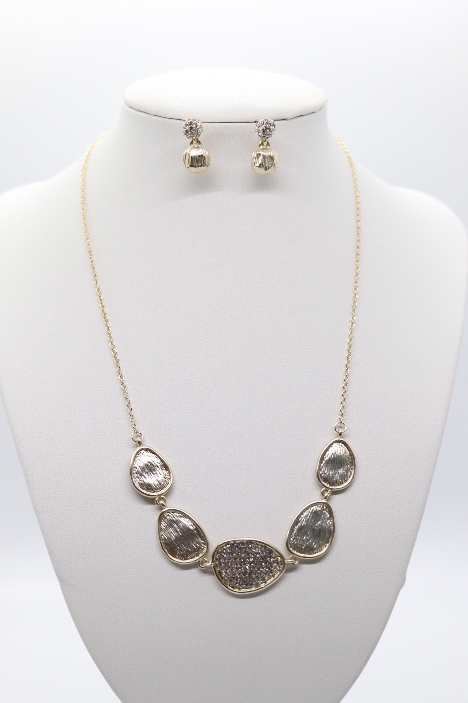 This necklace and earring set is made of gold. The necklace has a station design with four stations. The earrings have a station design with two stations.