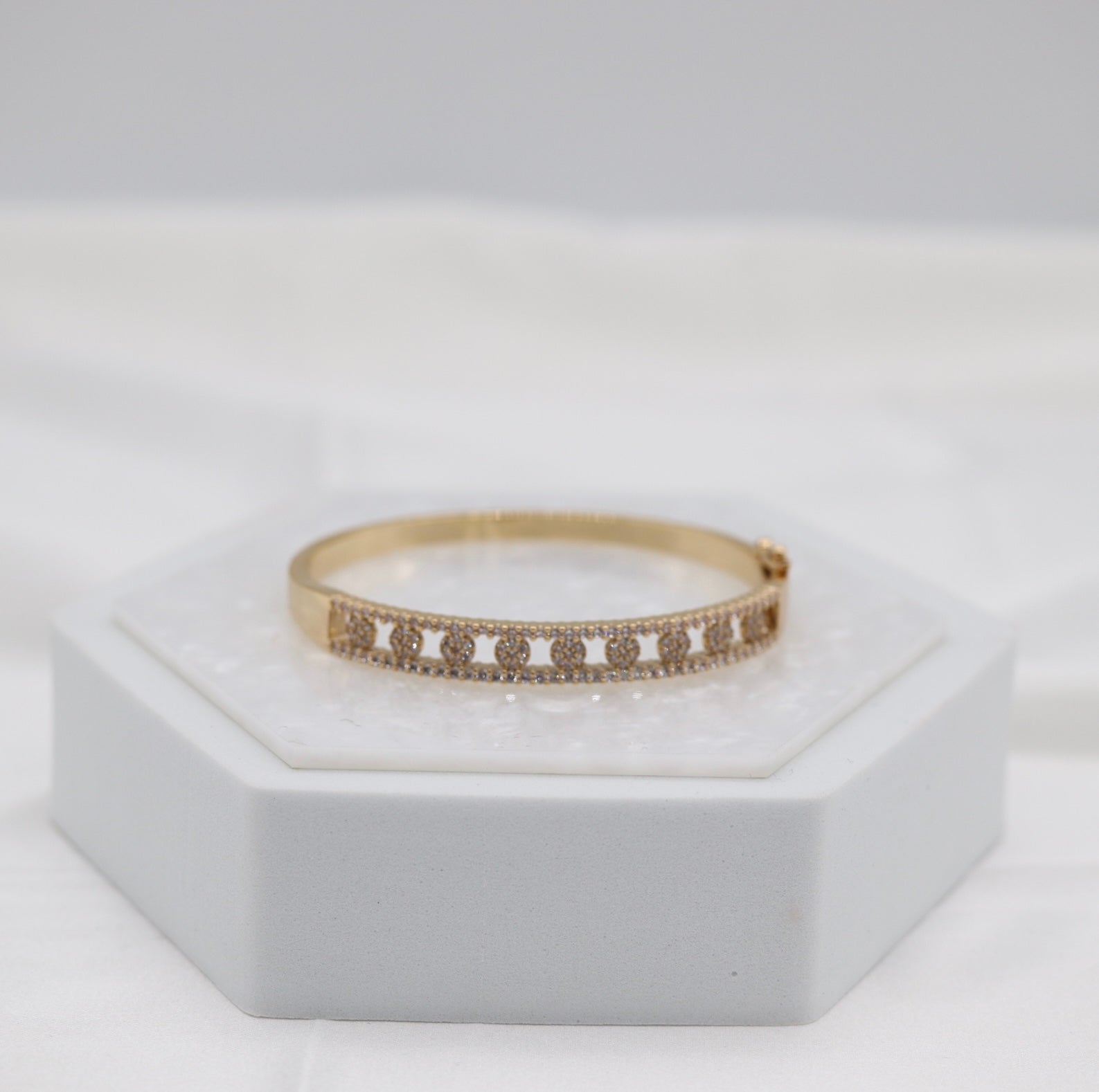 This refined gold-tone bangle features a row of oval-shaped pavé crystal links framed by delicate beaded detailing. Elegant and timeless, it adds just the right amount of sparkle to elevate both everyday and special-occasion looks.