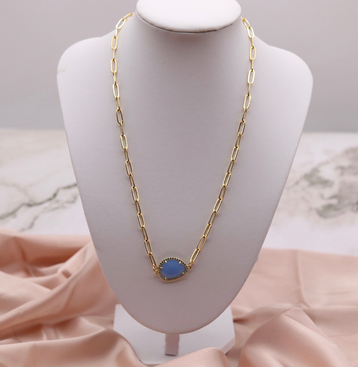 Gold Paperclip Chain Necklace with Sky Blue Pendant