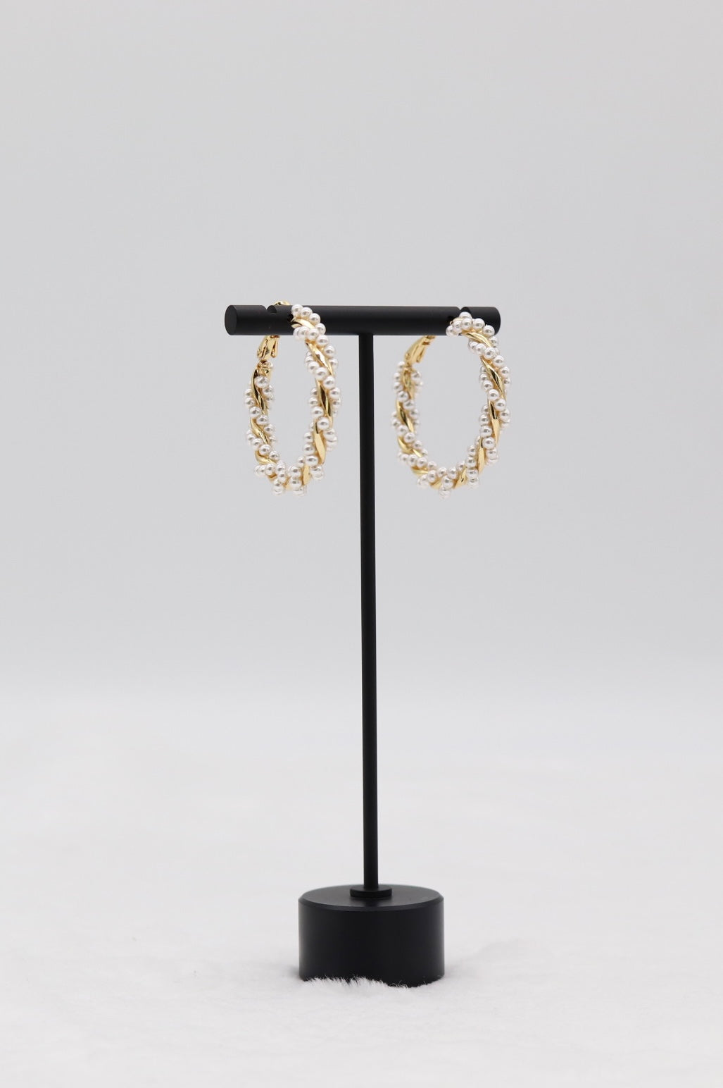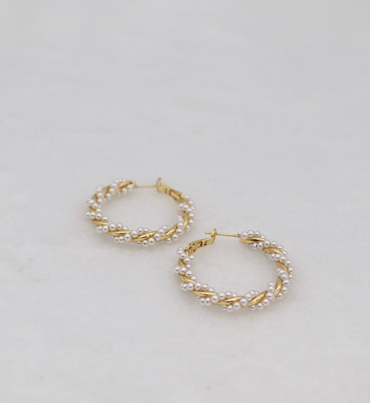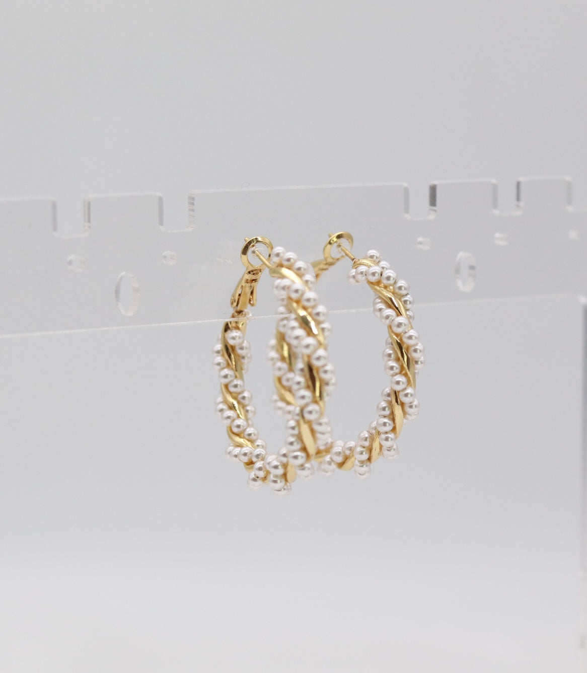 These hoops feature a unique twisted design of gold and delicate pearls, blending elegance with modern charm. Perfect for elevating both casual and dressy looks, they add a timeless touch of sophistication to any outfit.