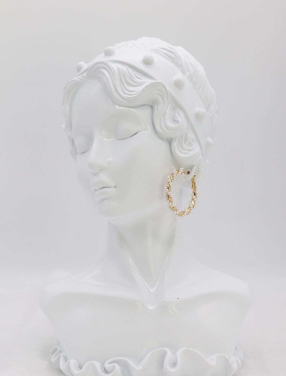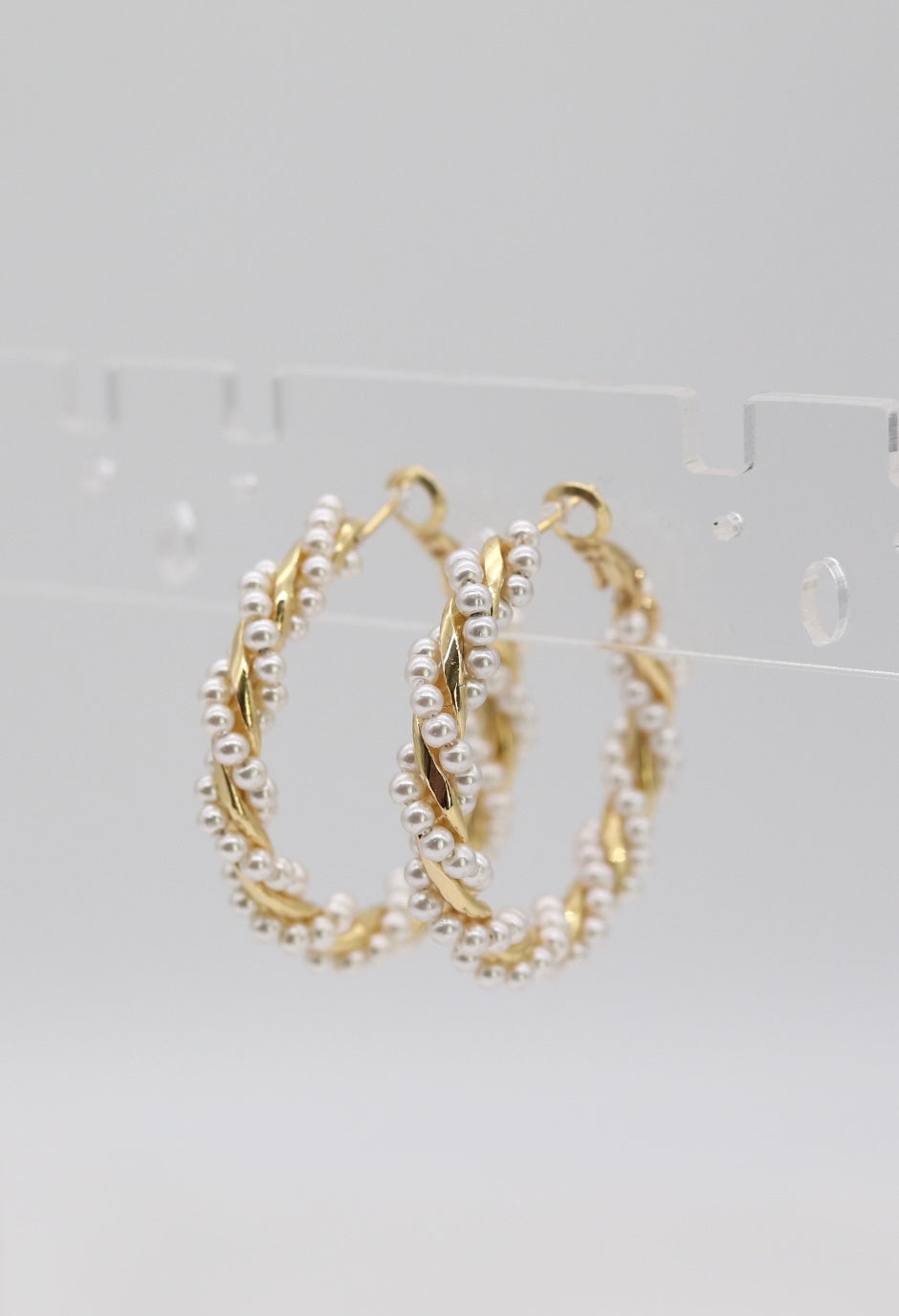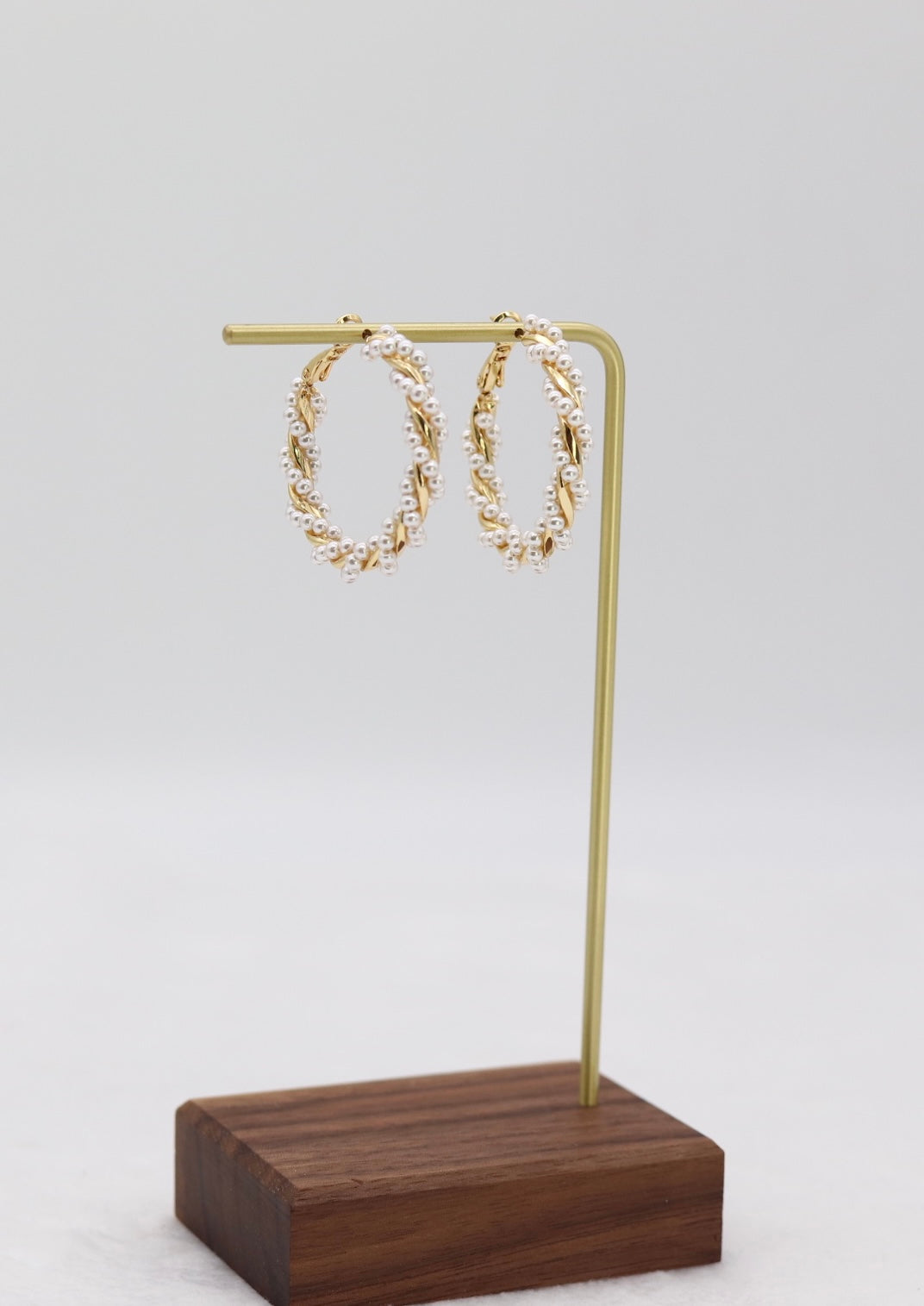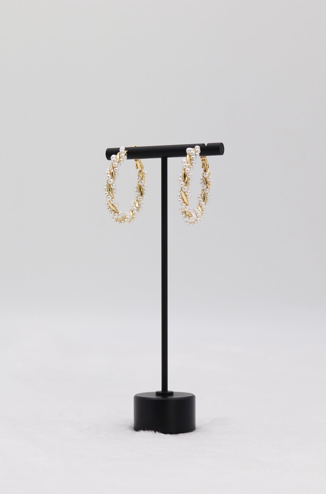 These hoops feature a unique twisted design of gold and delicate pearls, blending elegance with modern charm. Perfect for elevating both casual and dressy looks, they add a timeless touch of sophistication to any outfit.
