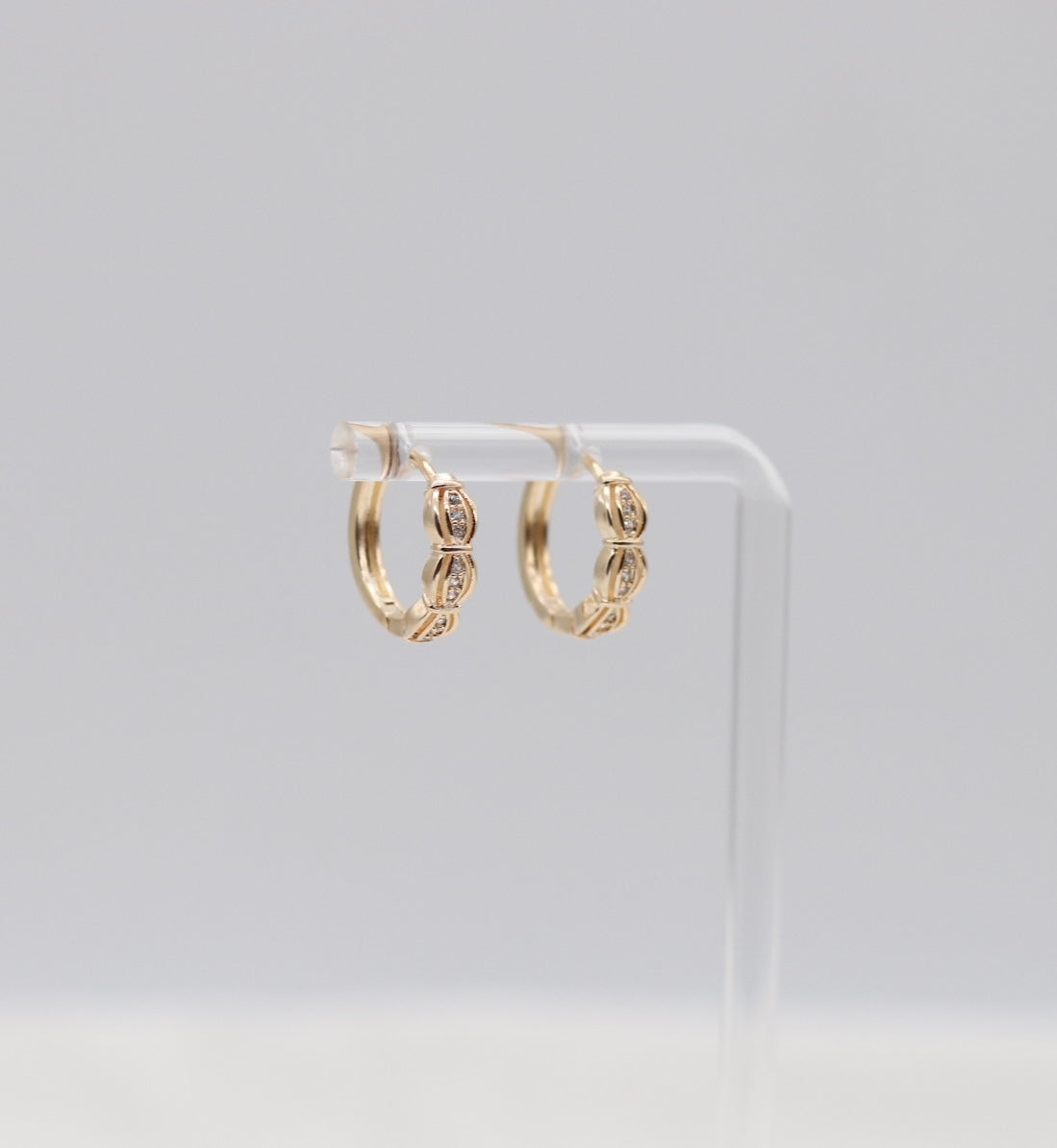 These elegant gold-tone hoop earrings feature a unique segmented design with shimmering crystal accents for a refined, modern look. The sculpted oval detailing adds dimension and sparkle, making them perfect for both everyday wear and dressed-up occasions. Lightweight yet eye-catching, these hoops bring effortless sophistication to any outfit — from casual chic to evening glam.