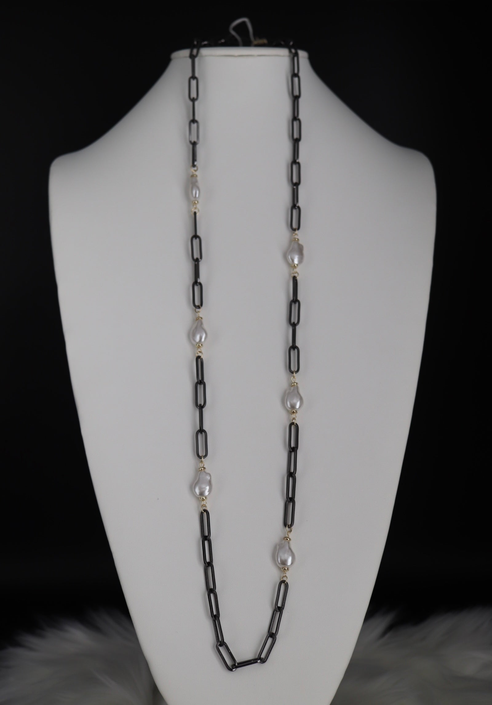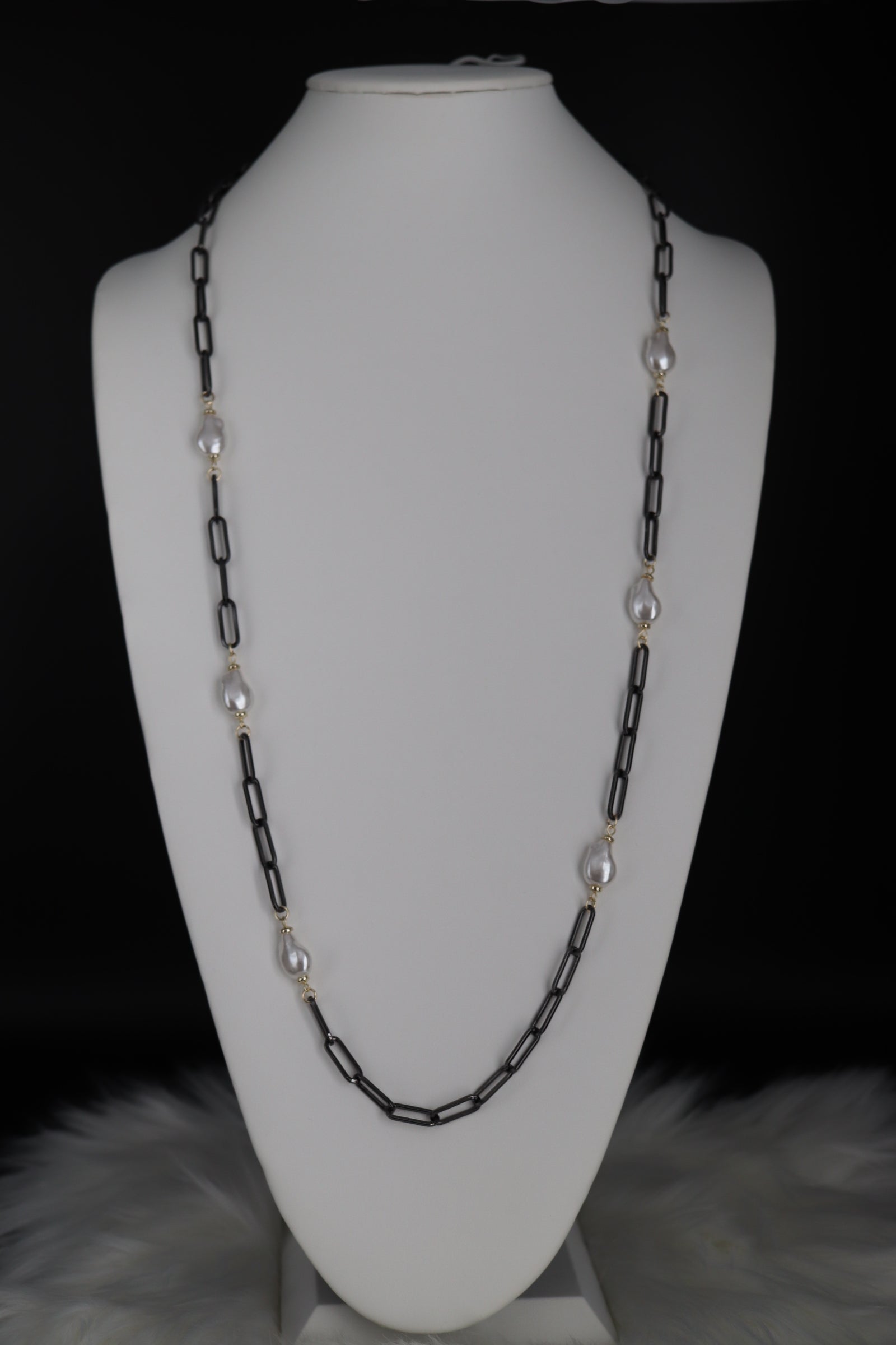 The lone black necklace with pearl stations features a striking contrast as lustrous pearls are stationed along a sleek black chain, creating an elegant and minimalist design. The combination of the deep black hue and the timeless pearls results in a uniquely sophisticated necklace that effortlessly blends modern style with classic charm.