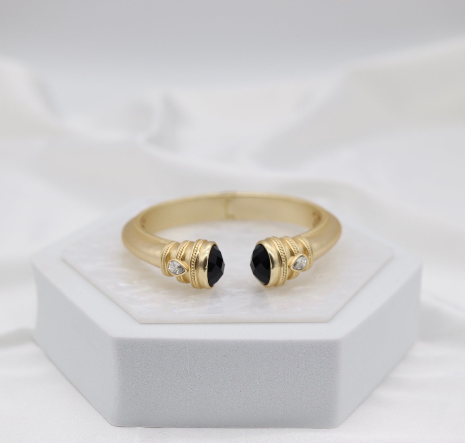 Sophisticated and bold, this gold hinged cuff features striking black onyx gemstones accented with teardrop crystal details for a refined finish. Its sleek, structured design makes it the perfect statement piece—elevating any outfit with timeless elegance and modern edge.