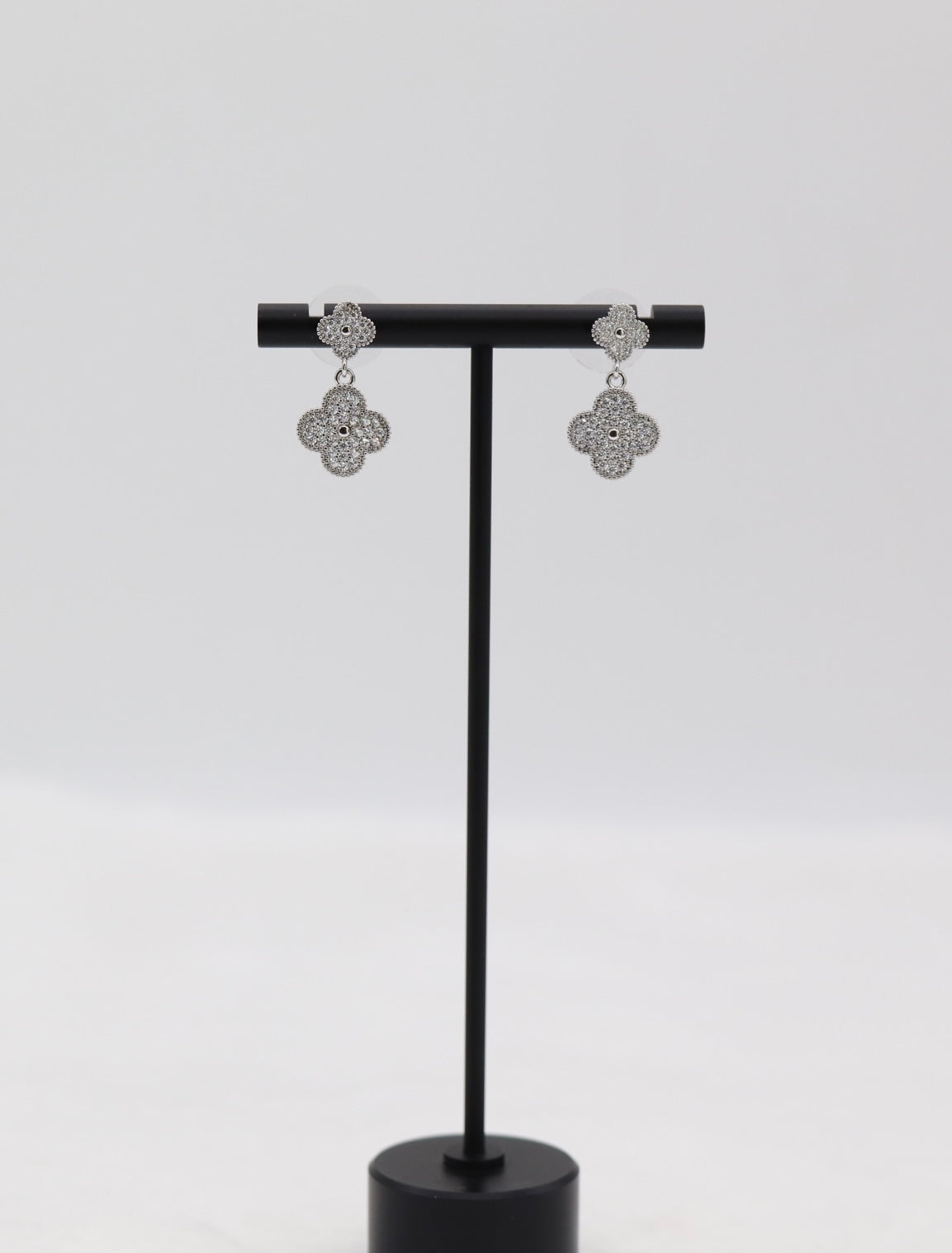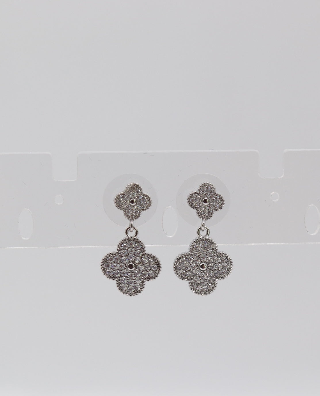 These elegant drop earrings feature a double clover design encrusted with sparkling stones, adding a refined touch of shine to your look. Perfect for both everyday wear and special occasions, they bring timeless charm and sophistication to any outfit.