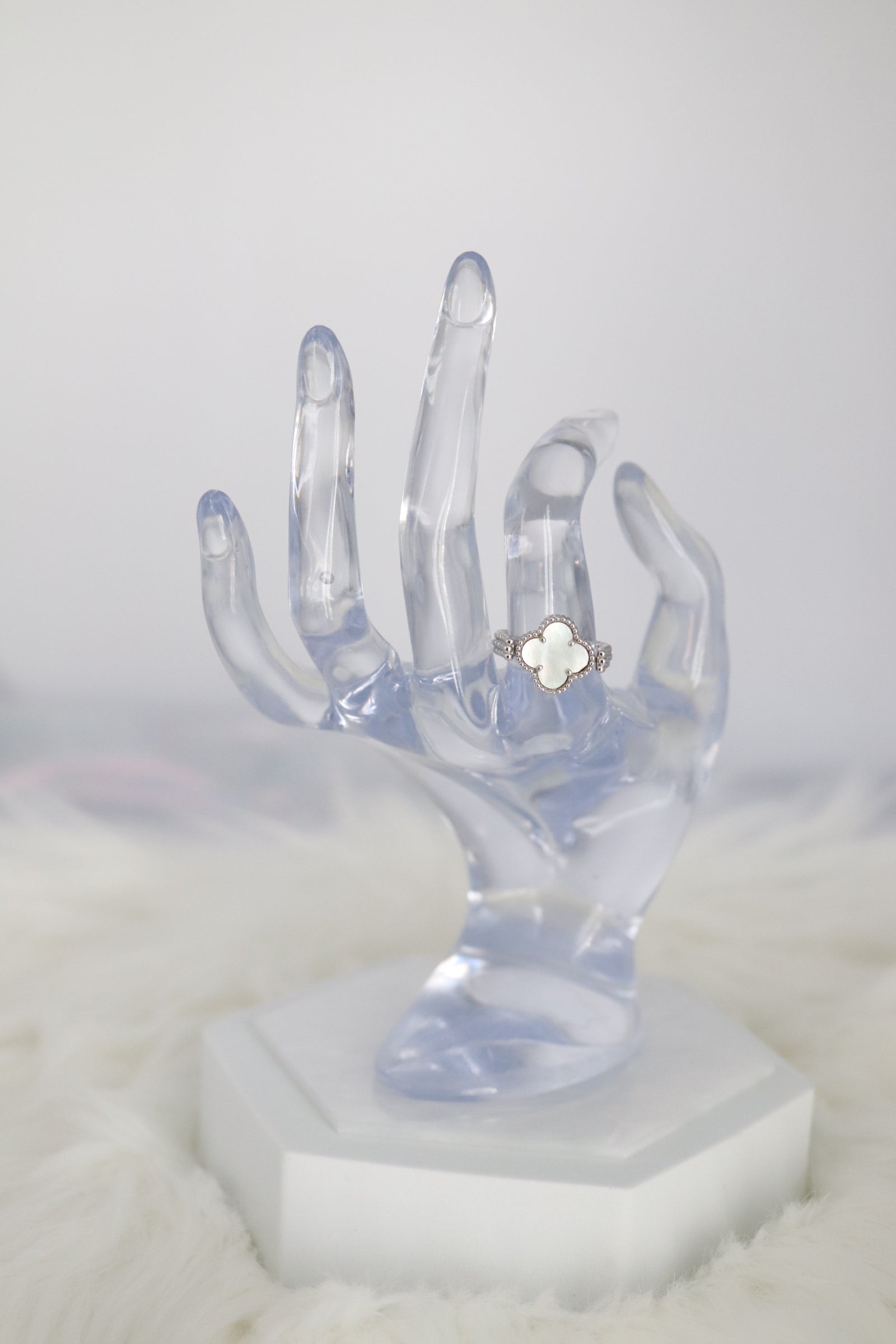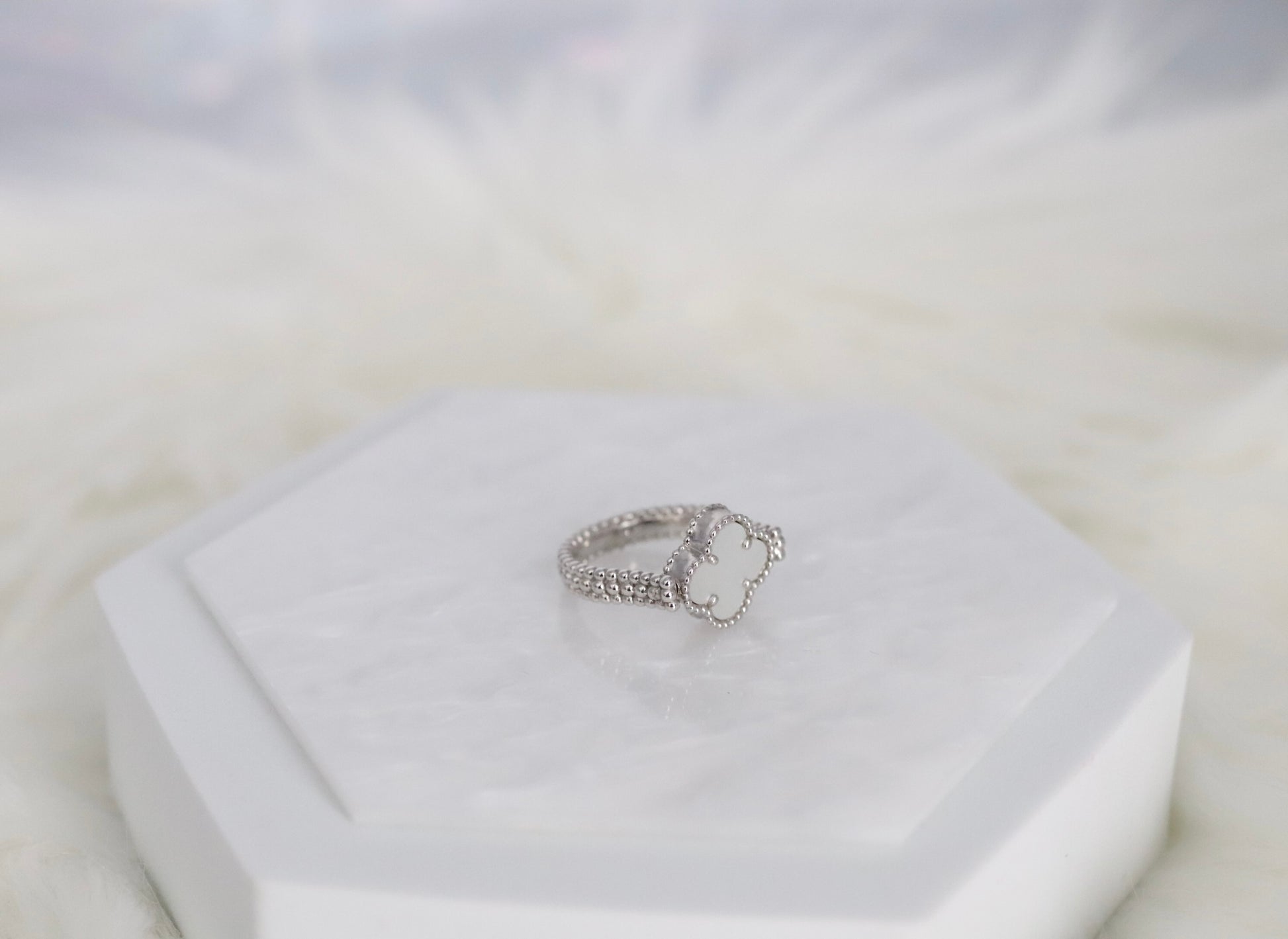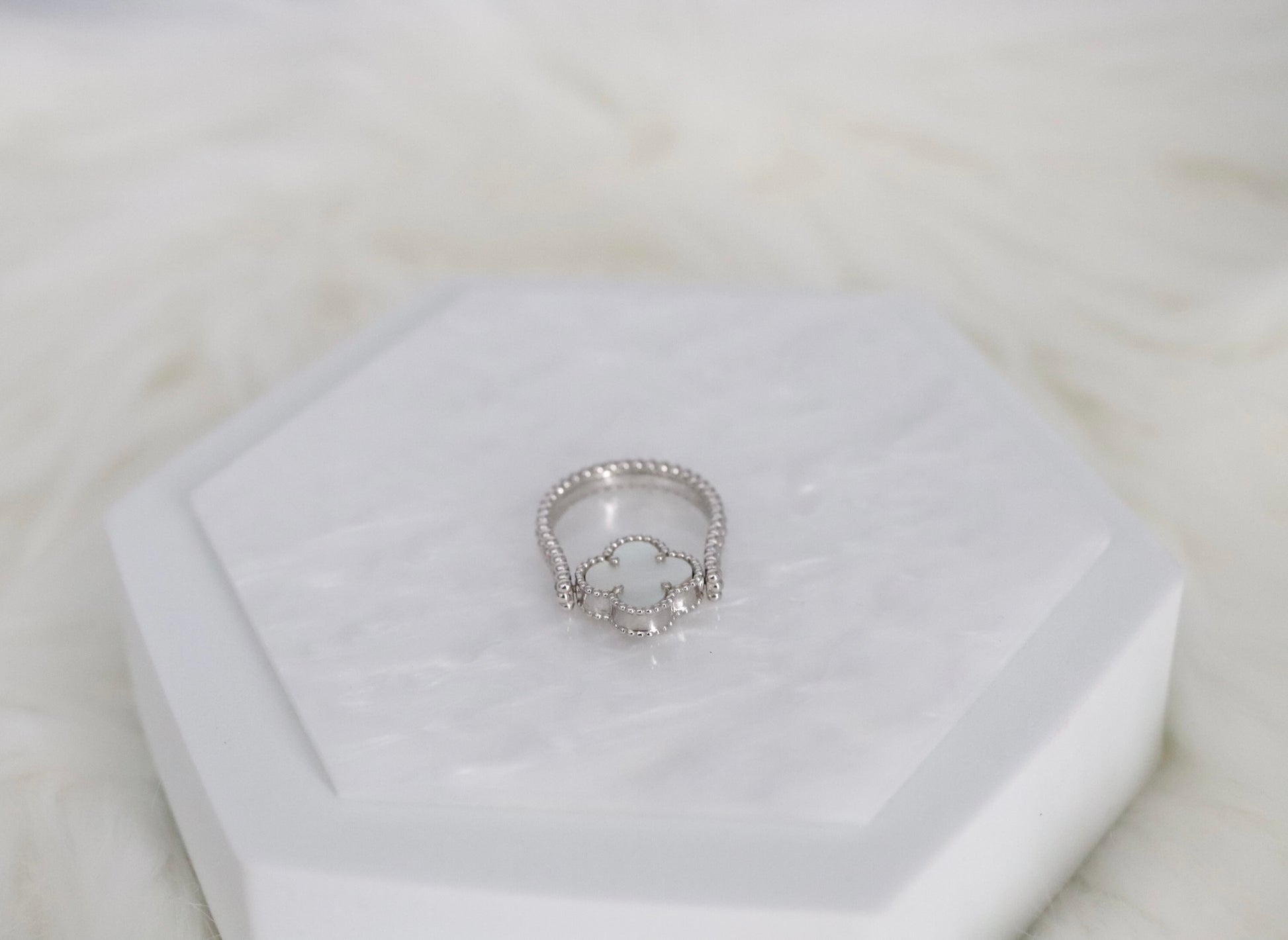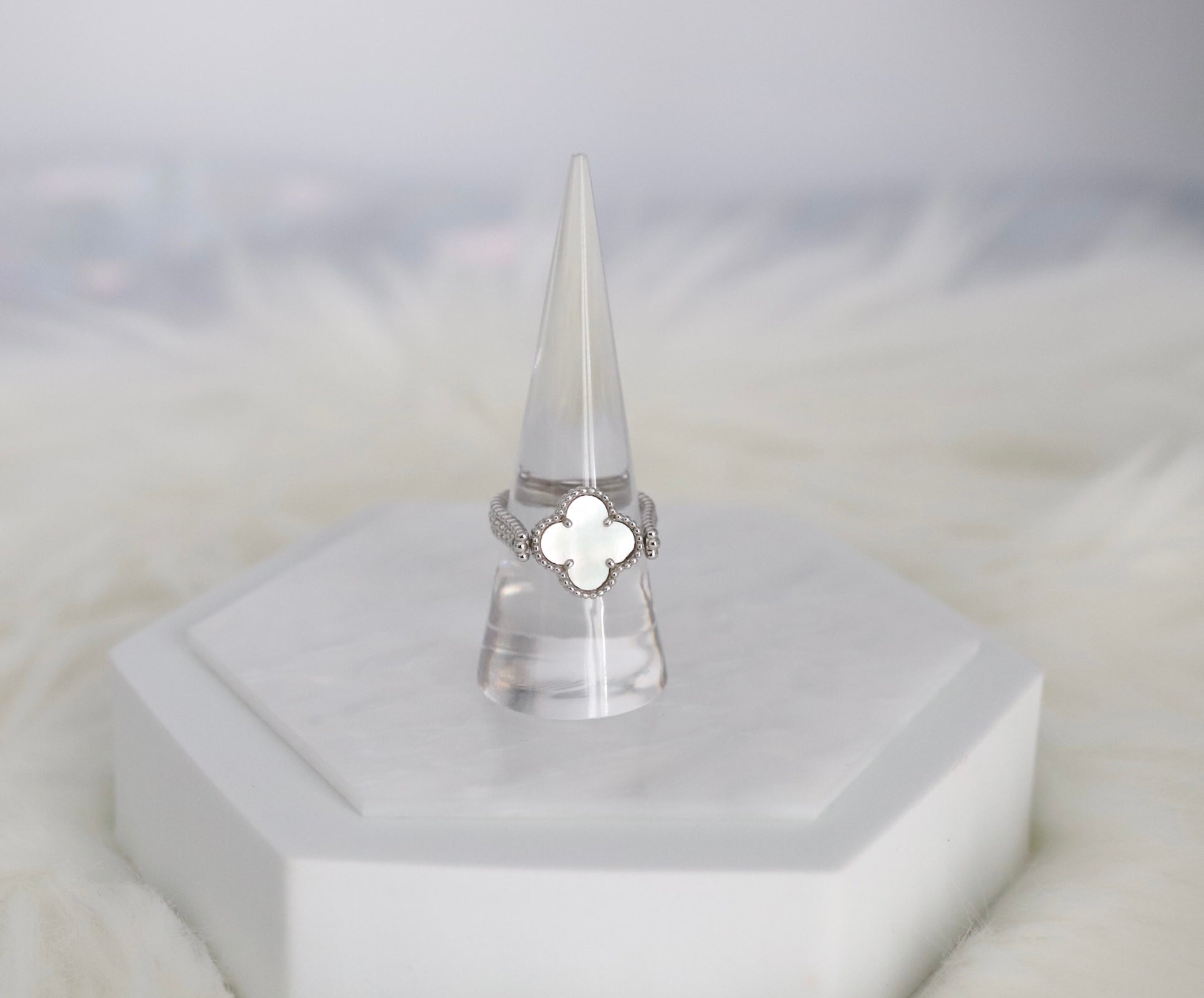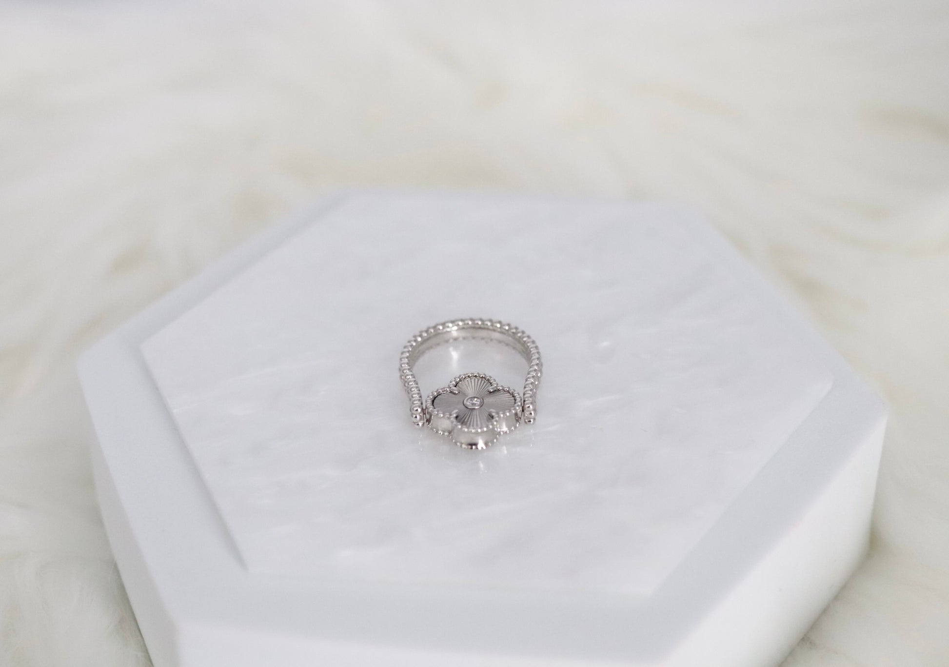 The Silver Clover Silver Reversible Ring is an exquisite piece of jewelry, showcasing a delicate silver clover design on one side and a smooth, mirror-like silver finish on the reverse. This reversible functionality allows for a seamless transition between a detailed, intricate look and a minimalist, elegant style, making it a versatile addition to any jewelry collection.