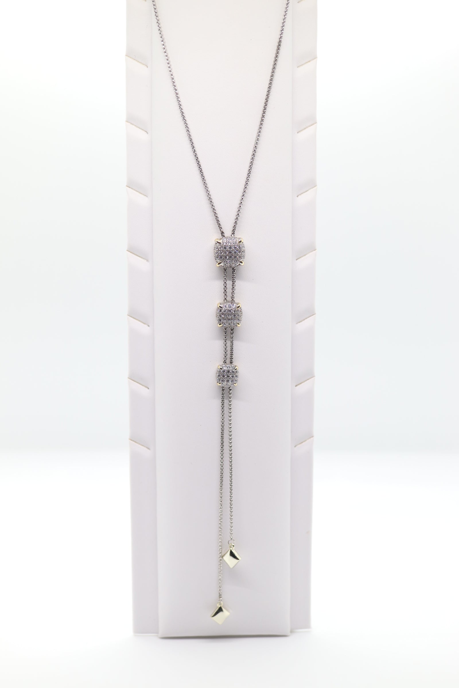 The Graduated Three CZ Station Necklace showcase a sophisticated design with three cubic zirconia stones of increasing size, elegantly set in a vertical line. These sparkling stones are mounted on a sleek, metallic base, offering a refined and glamorous look suitable for both formal and casual occasions.
