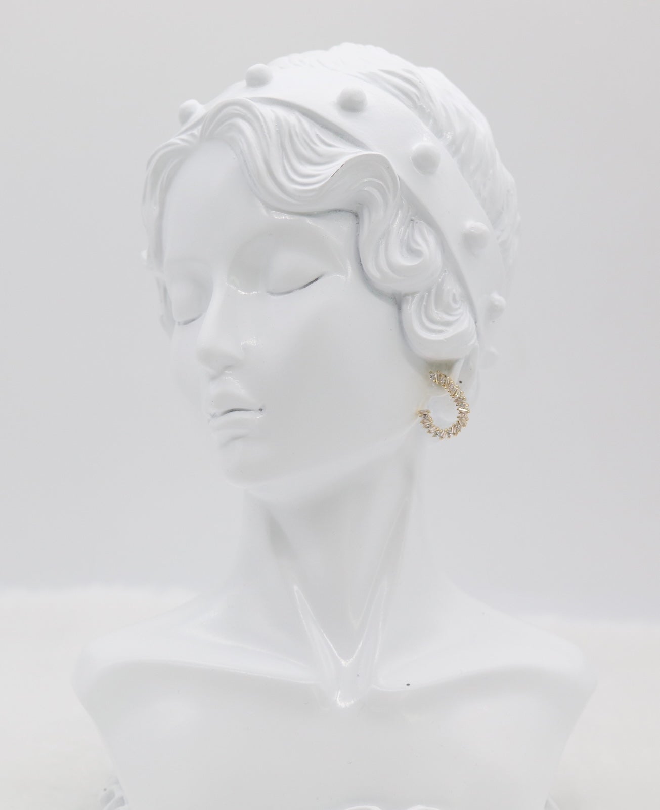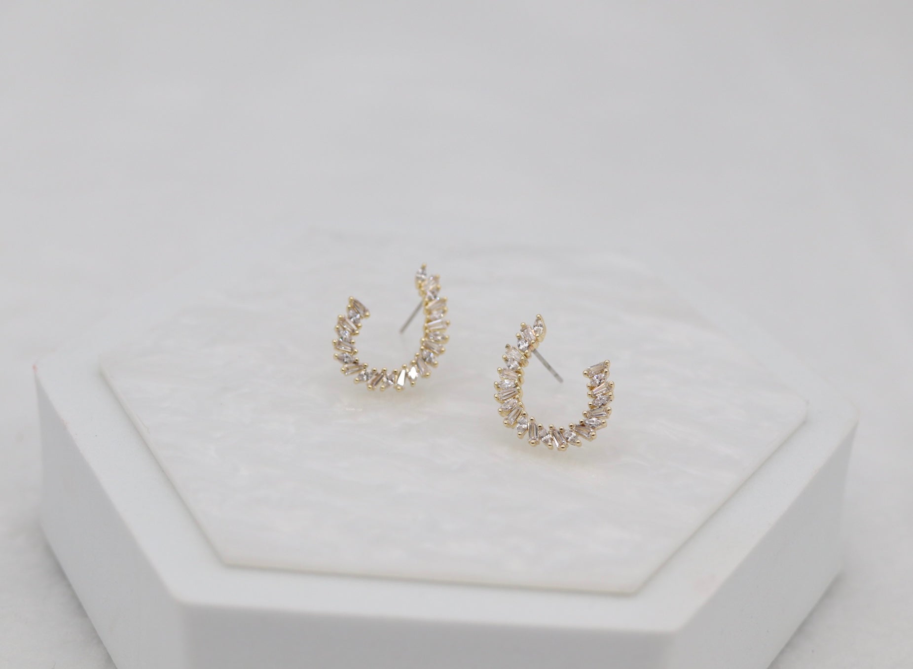 These dazzling hoops are lined with shimmering baguette-cut stones that catch the light from every angle. Elegant and eye-catching, they’re perfect for adding a touch of glamour to both day and evening looks.