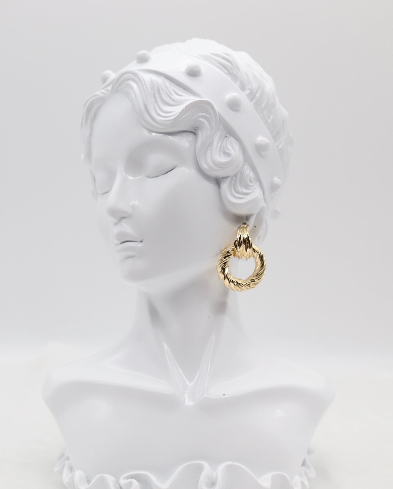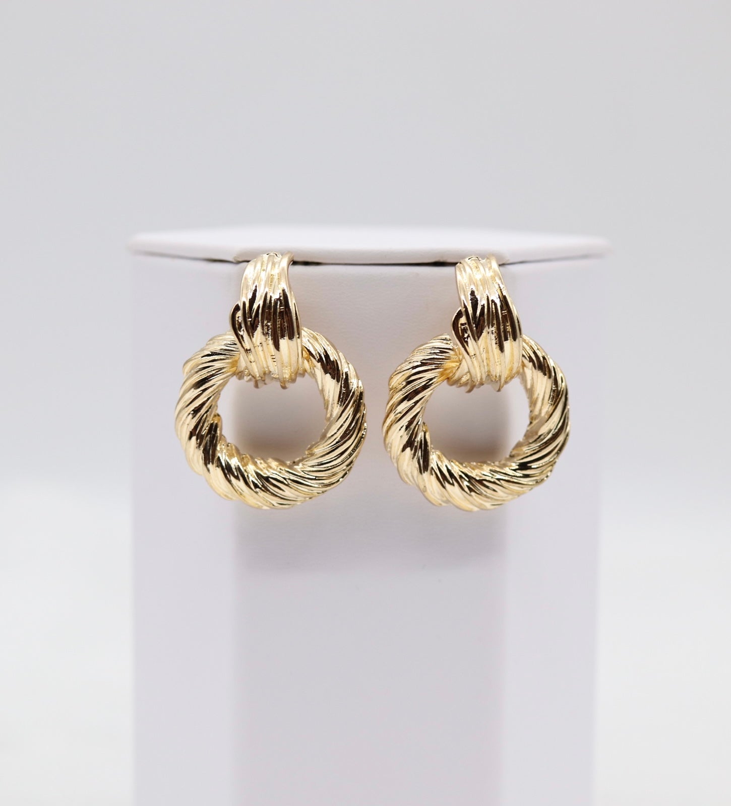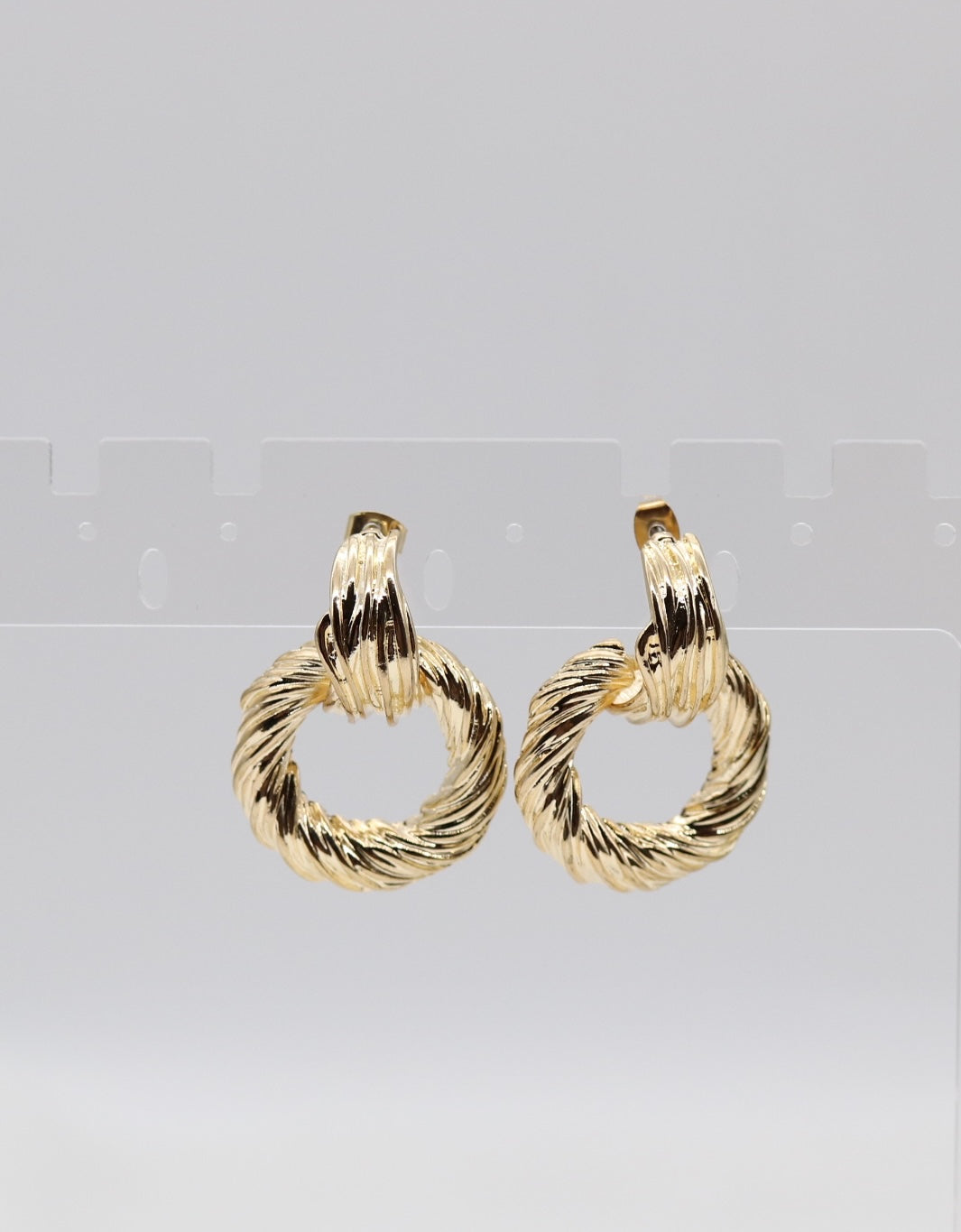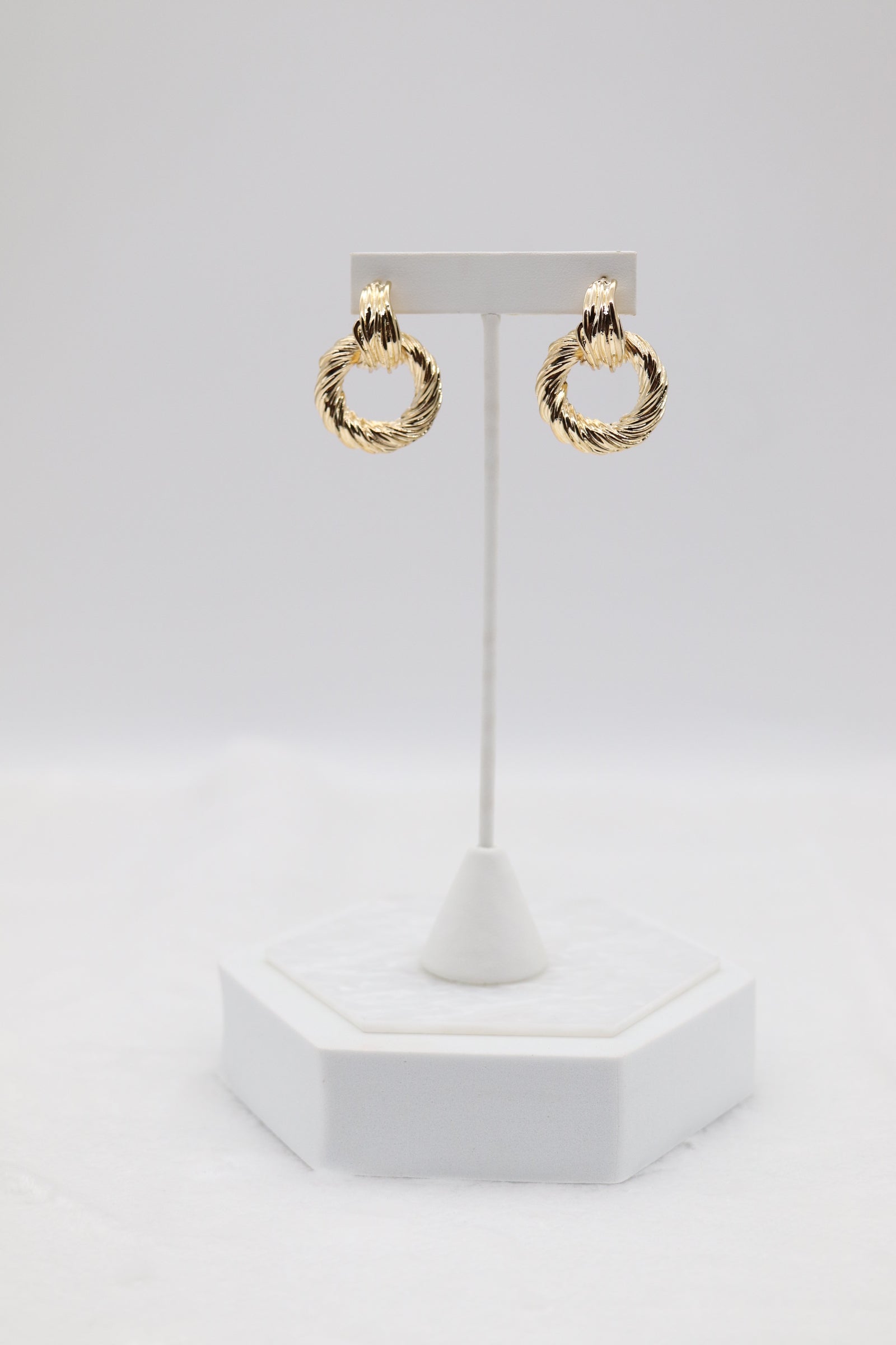 These textured gold twisted circle drop earrings feature a bold rope-inspired design with a brilliant shine. Their unique, elegant style makes them perfect for adding sophistication and charm to any outfit.