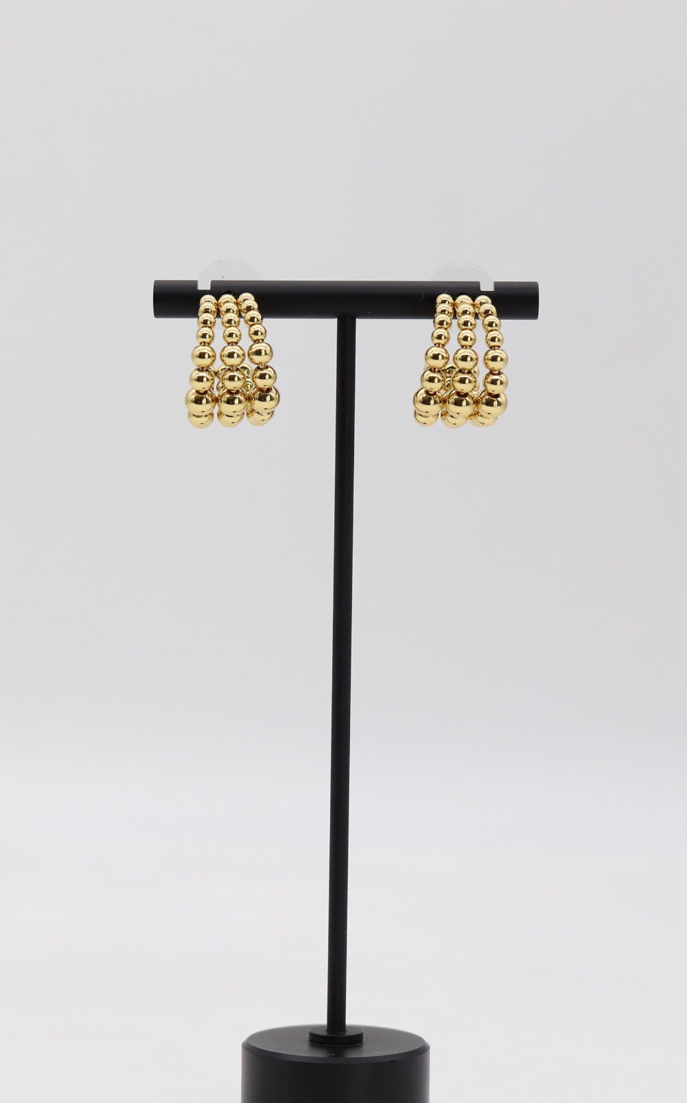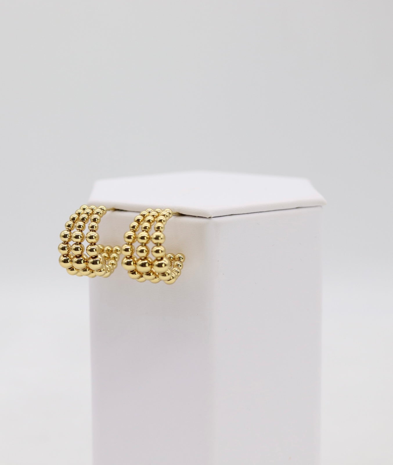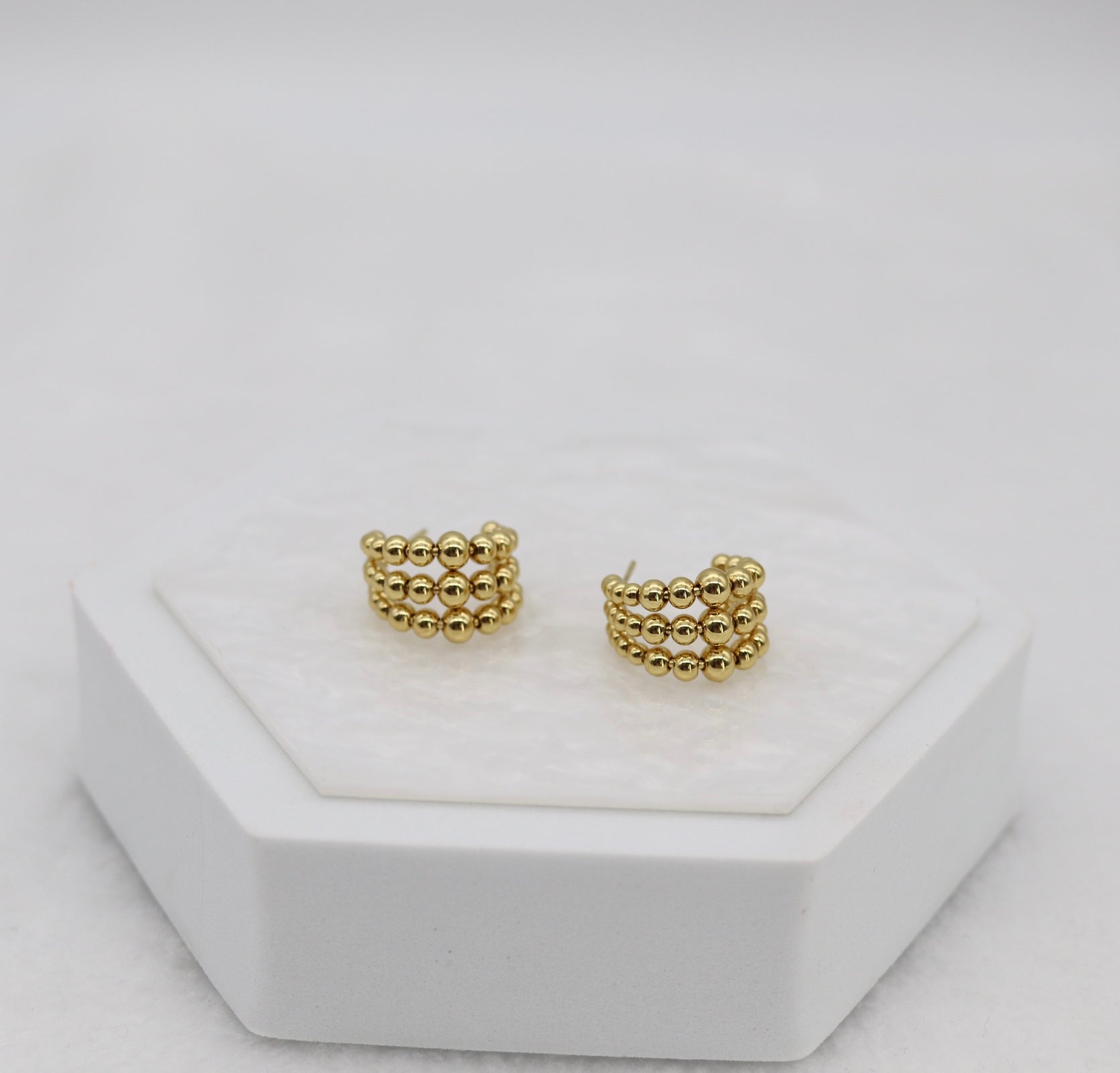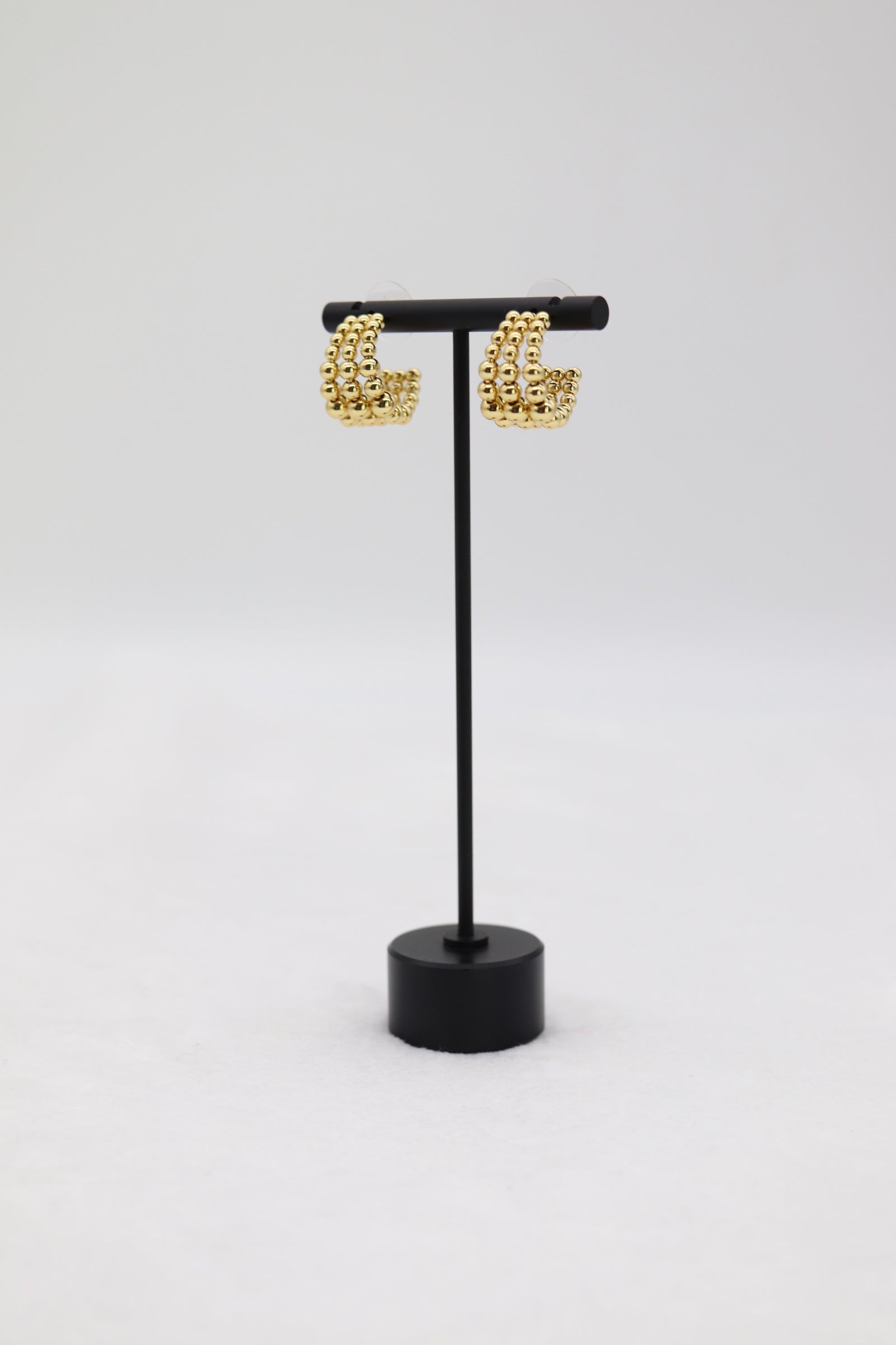 These elegant hoops feature three rows of polished gold beads, creating a bold yet refined look that adds texture and shine to any outfit. Lightweight and versatile, they’re the perfect everyday accessory that transitions effortlessly from day to night.