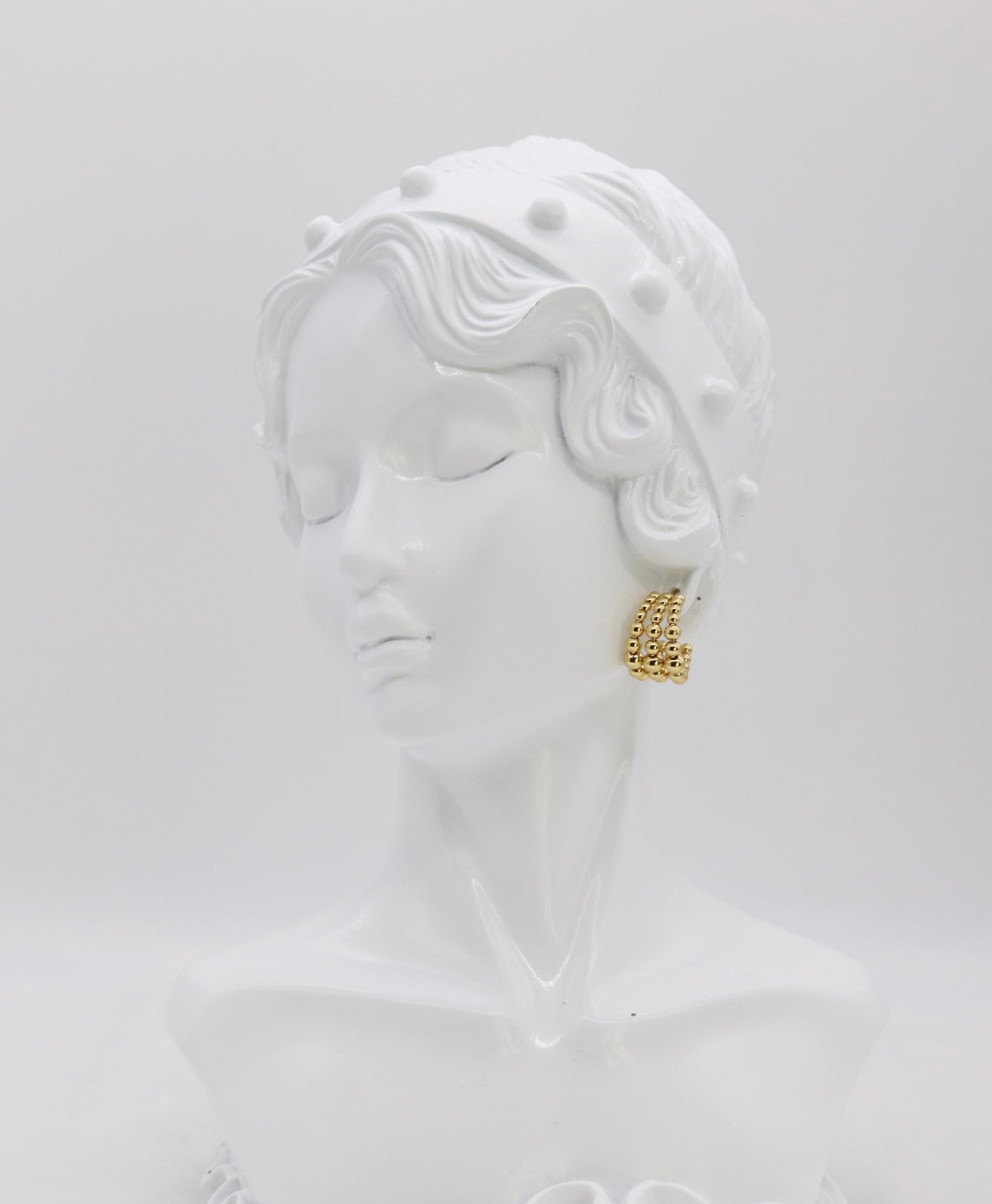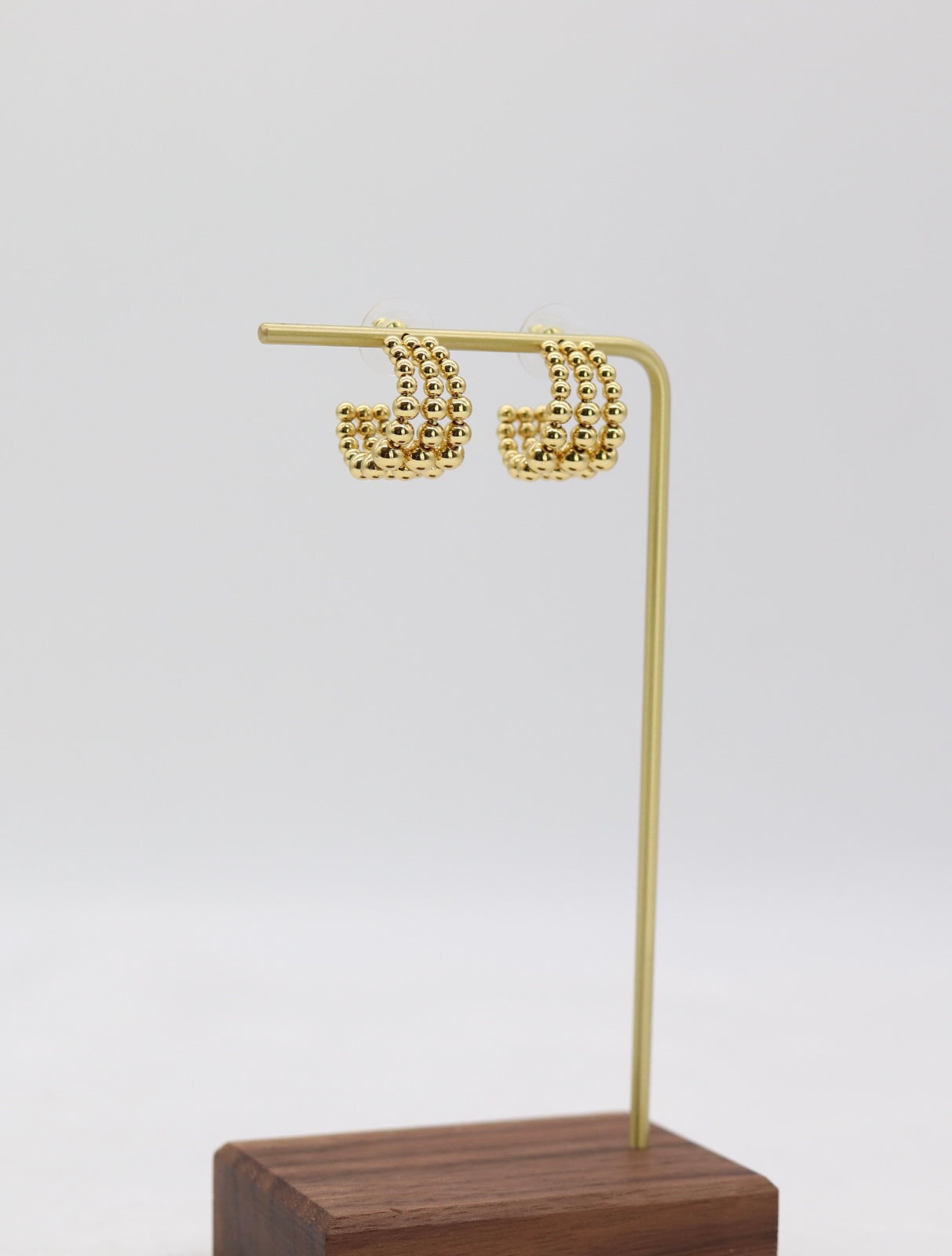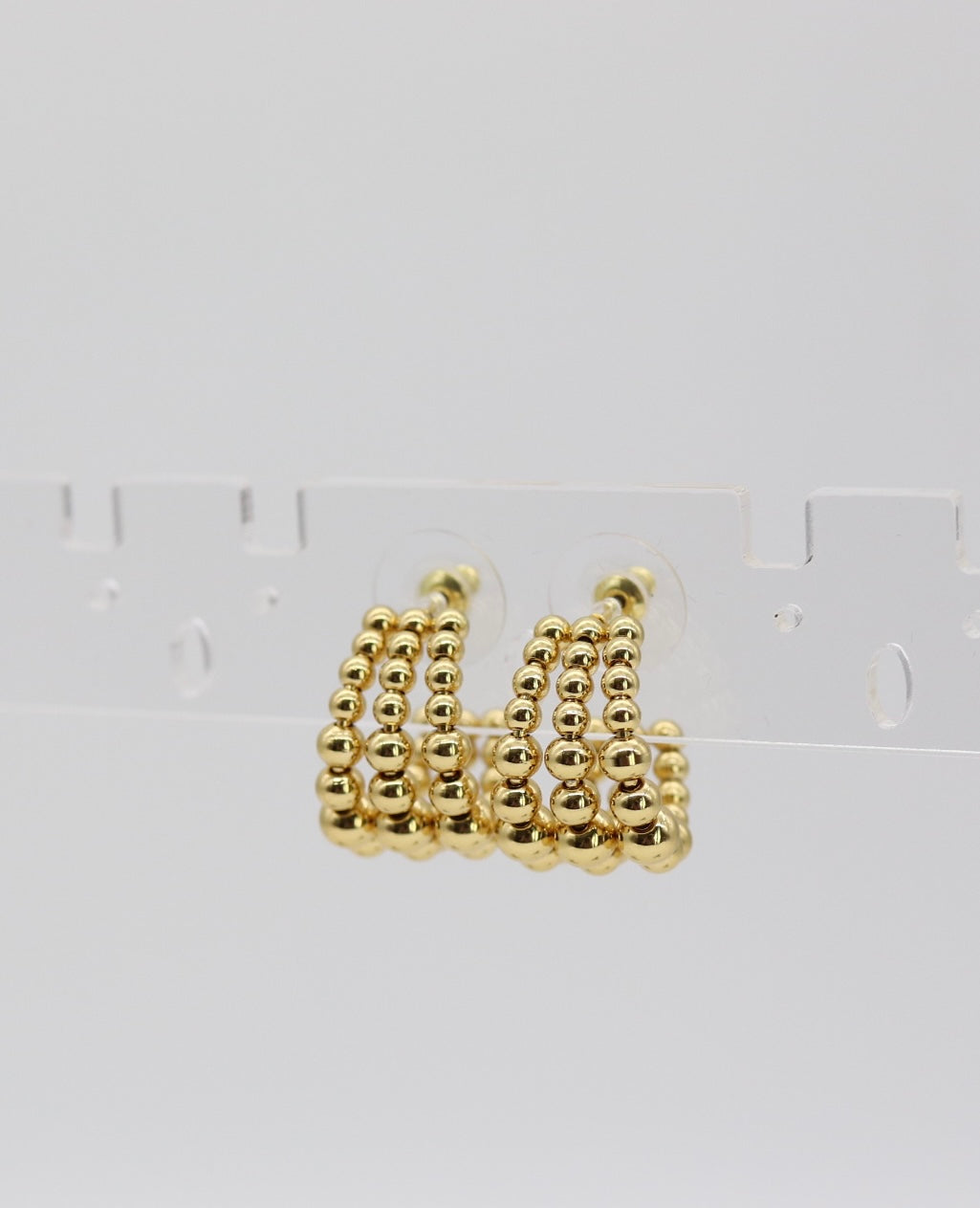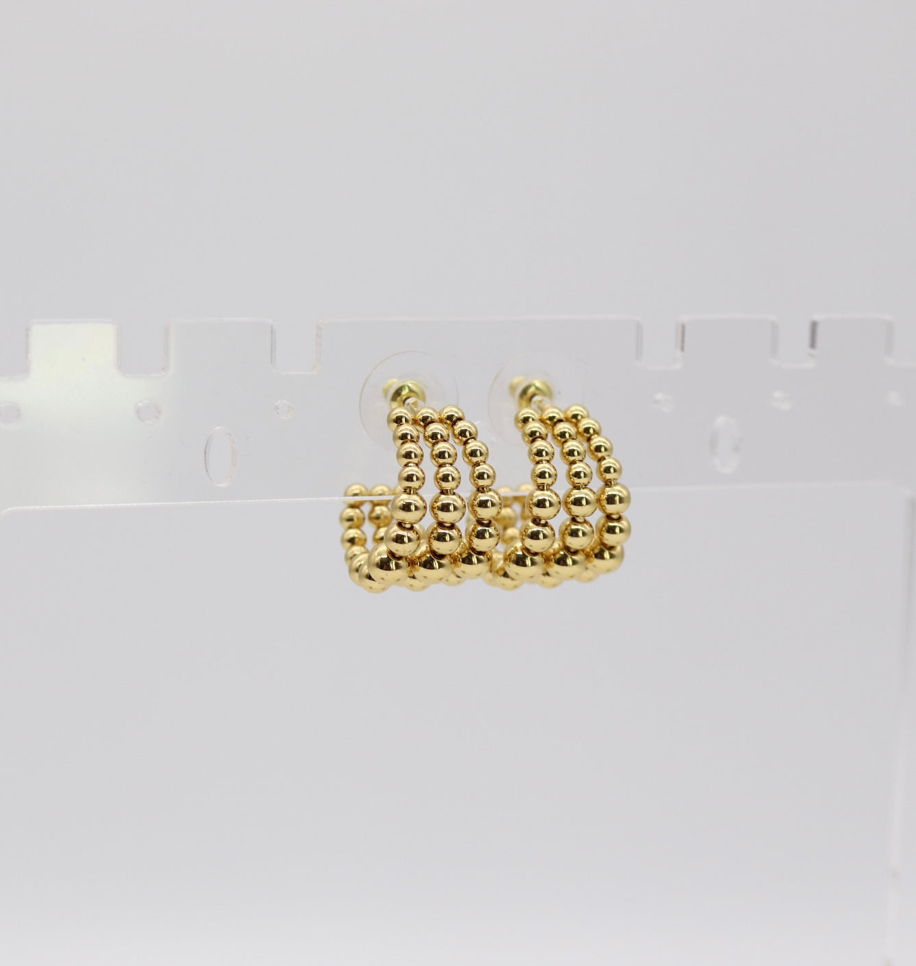These elegant hoops feature three rows of polished gold beads, creating a bold yet refined look that adds texture and shine to any outfit. Lightweight and versatile, they’re the perfect everyday accessory that transitions effortlessly from day to night.