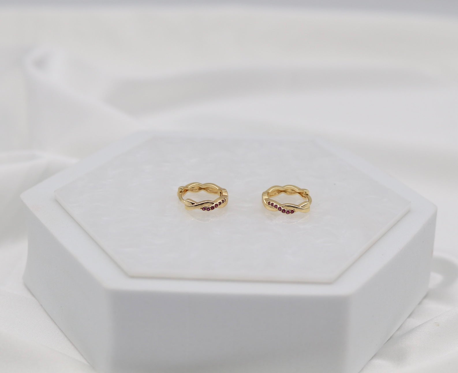 Twisted Gold Ruby Crystal Huggie Earrings