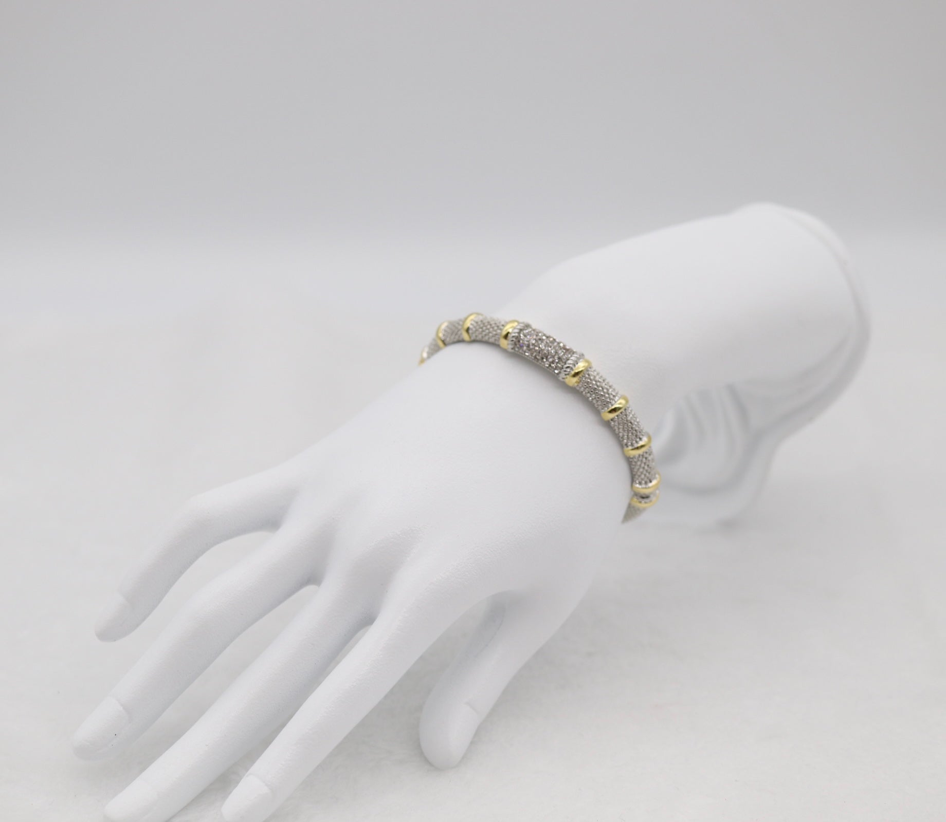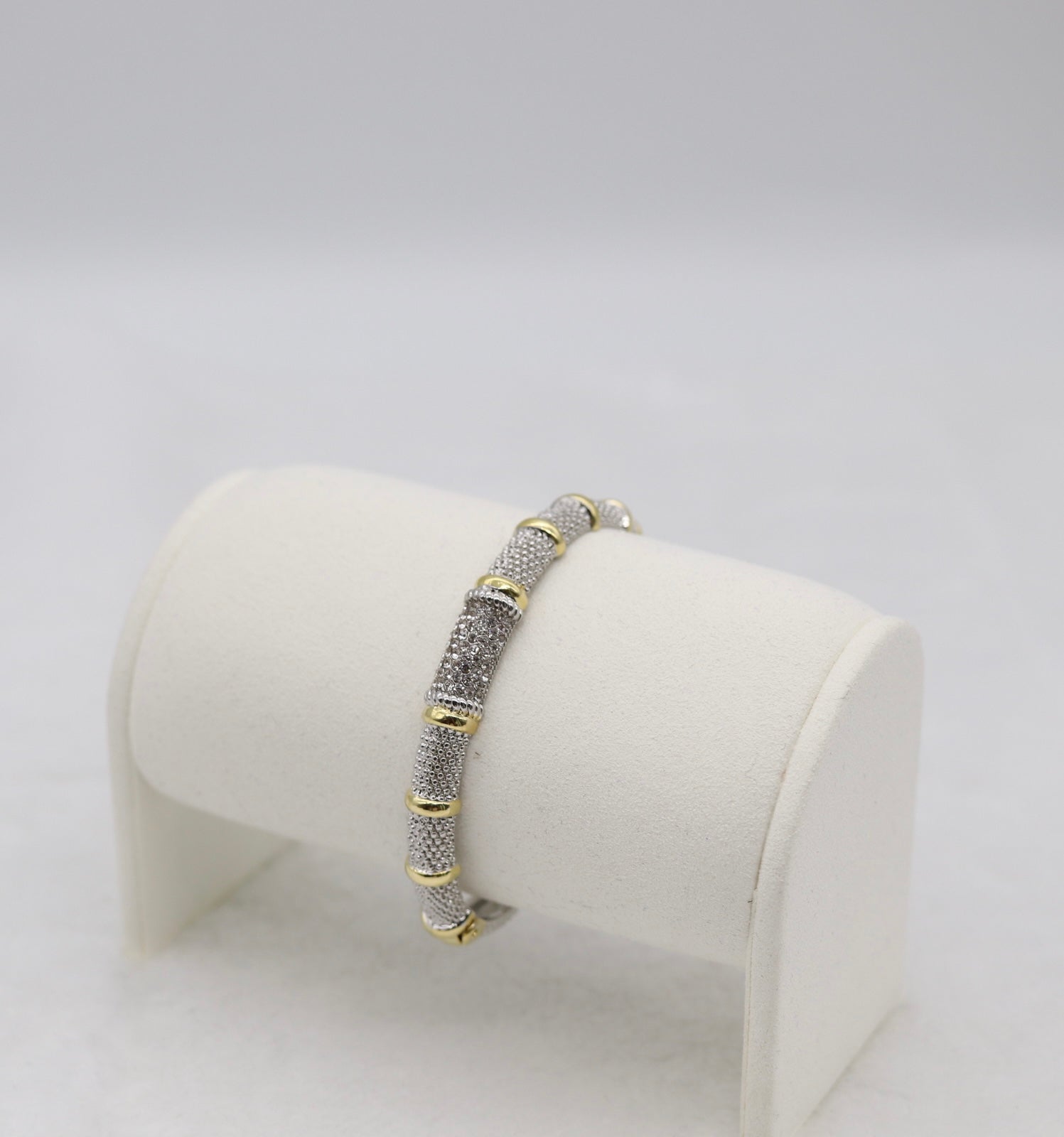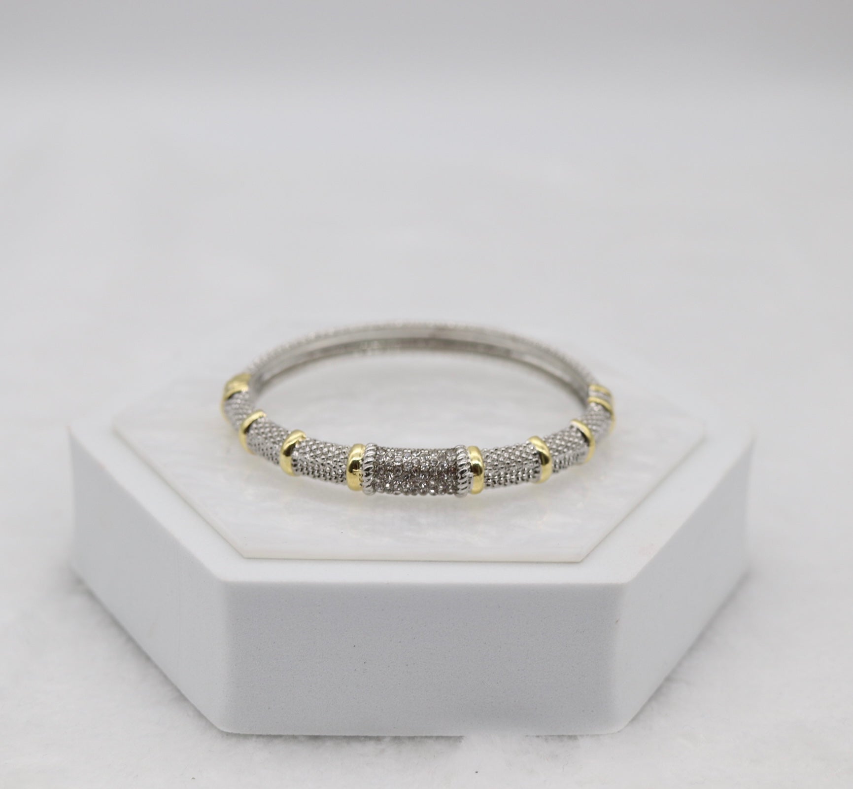 This elegant bangle features shimmering pave-set stones in textured silver segments, accented with polished gold-tone bands for a striking two-tone design. The hinged closure ensures easy wear, making it a versatile piece perfect for both everyday elegance and evening glamour.